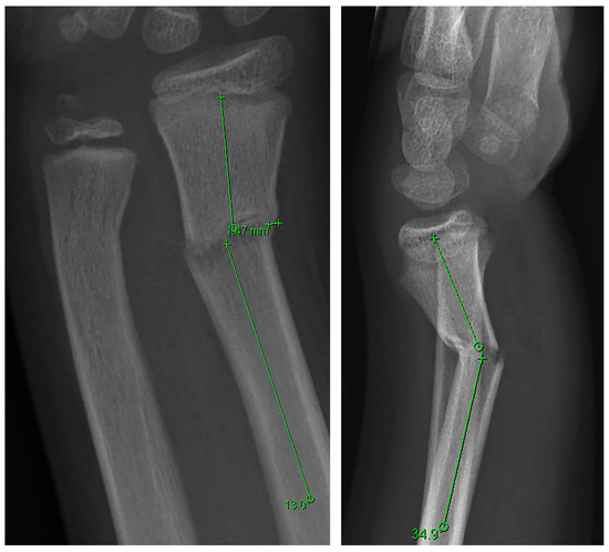 Radiographic measurement technique: Pre-reduction posteroanterior (PA) and lateral radiographs of an 11-year-old boy with a distal metaphyseal forearm fracture. The PA view demonstrates 13.0° of radial angulation of the radius, and the lateral view demonstrates 34.9° of dorsal angulation.
