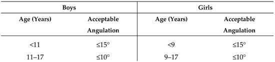 Based on our findings, we interpreted the absence of inferior long-term outcomes in children with accepted secondary displacement as evidence that residual angulation—within certain limits—can be safely tolerated in patients with sufficient remaining growth. Accordingly, rather than deriving strict angulation cut-off values from statistical thresholds within our cohort, we developed clinically applicable recommendations by integrating our outcome data with the above-mentioned established treatment guidelines and remodeling data from the literature, while explicitly accounting for sex-related differences in skeletal maturation. Our age- and sex-specific recommendations for acceptable residual sagittal angulation, summarized in Figure 3, are intended to reflect expected remodeling capacity across pediatric age groups and to support informed clinical decision-making.