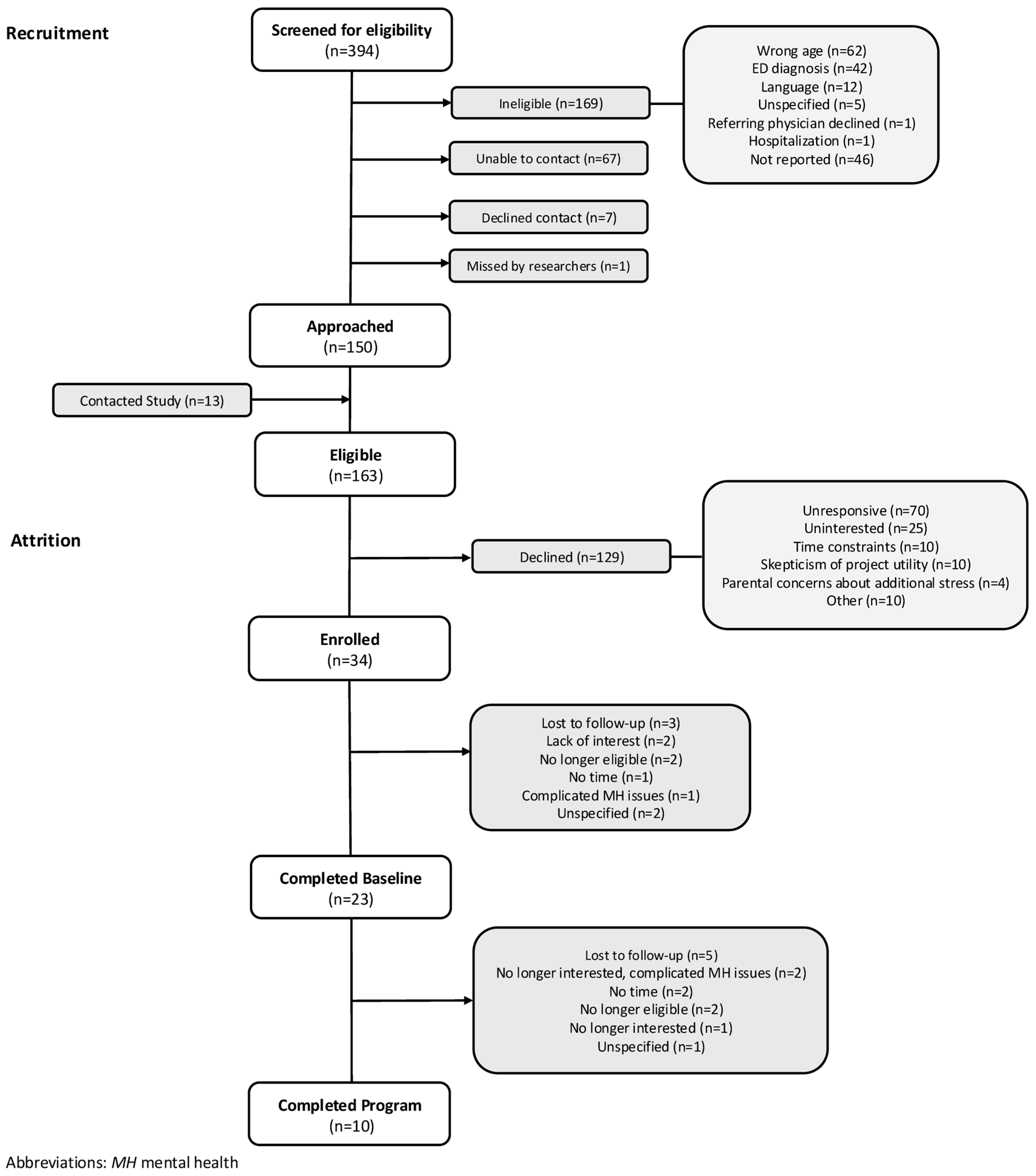 A total of 394 youth were screened for eligibility (Figure 1). Of these, 169 were ineligible, most commonly due to age (n = 62), eating disorder diagnosis (n = 42), or English-language limitations (n = 12.) Among the 163 youth determined to be eligible, 129 declined participation. The most cited reasons included being unresponsive (n = 70), a lack of interest (n = 25), time constraints (n = 10), skepticism about project utility (n = 10), and parental concerns of added stress (n = 4). In total, 34 youth consented and enrolled, representing 21% of those eligible. Of the 34 enrolled participants, 11 withdrew prior to completing baseline assessments. The reasons for pre-baseline withdrawal included loss to follow-up (n = 3), lack of interest (n = 2), no longer being eligible (n = 2), time constraints (n = 1), and complicated mental health issues (n = 1). Of the 23 youth who completed the baseline assessments, an additional 13 withdrew during the 3-month access period, most commonly due to loss to follow-up (n = 5), lack of interest/complicated mental health issues (n = 3), time constraints (n = 2), and no longer being eligible (n = 2). Participant recruitment and attrition are further detailed in Figure 1.