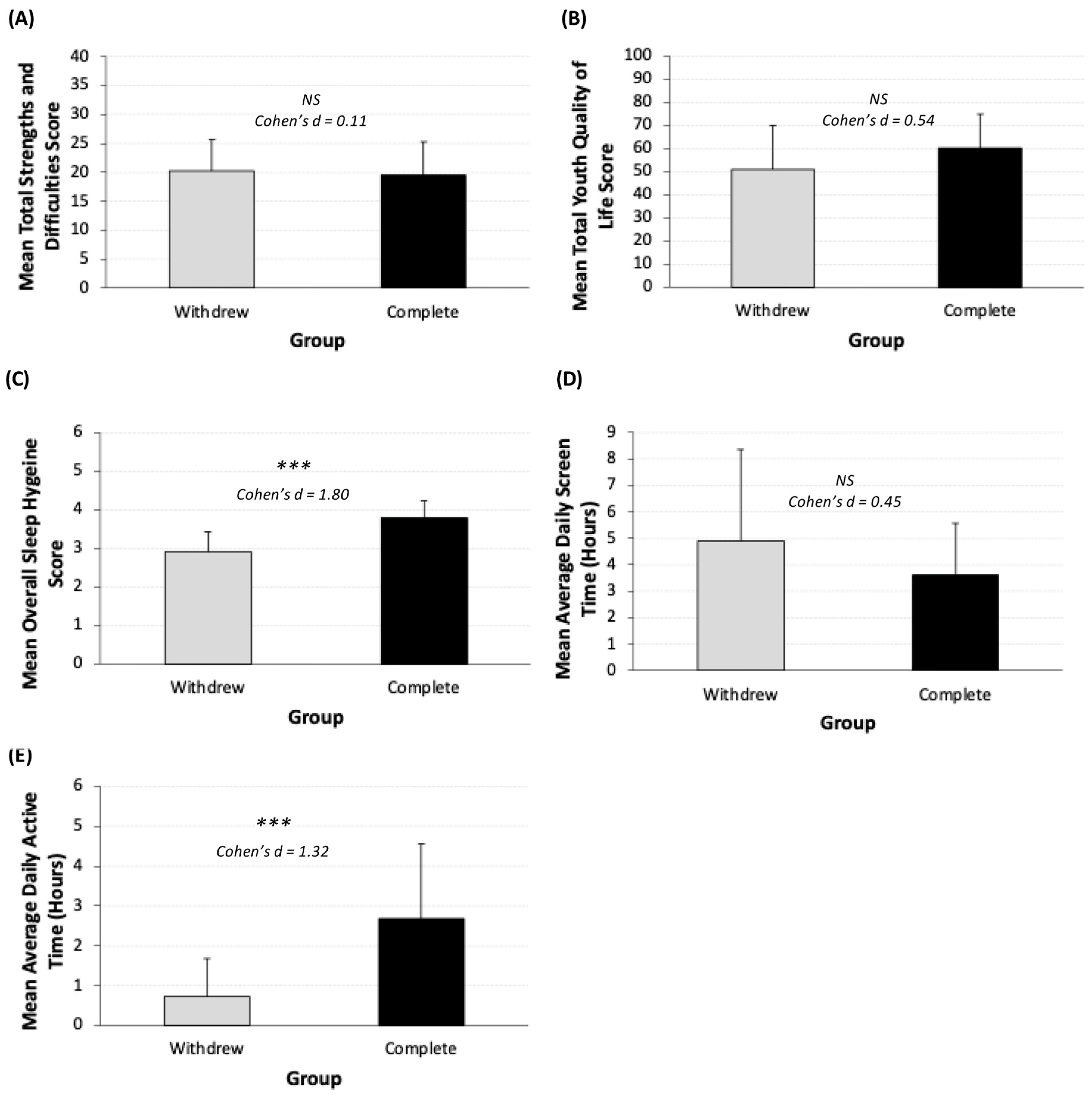 Figure 2. (AE). Comparison of baseline scores by study completion/withdrawal. (A) Strengths and difficulties (total SDQ) (withdrew: n = 9; Completed: n = 10); (B) youth quality of life (withdrew: n = 9; complete: n = 10); (C) sleep hygiene score (withdrew: n = 13; completed: n = 10); (D) average daily screen time (withdrew: n = 10; completed: n = 10). (E) Average daily active hours (withdrew: n = 8; completed: n = 10); error bars represent standard deviation. Asterisks represent level of significance (p > 0.1 = NS, p < 0.05 = ***) . Sample sizes vary across analyses due to incomplete assessment completion. Participants who did not complete a given assessment were excluded from the analyses for that outcome.