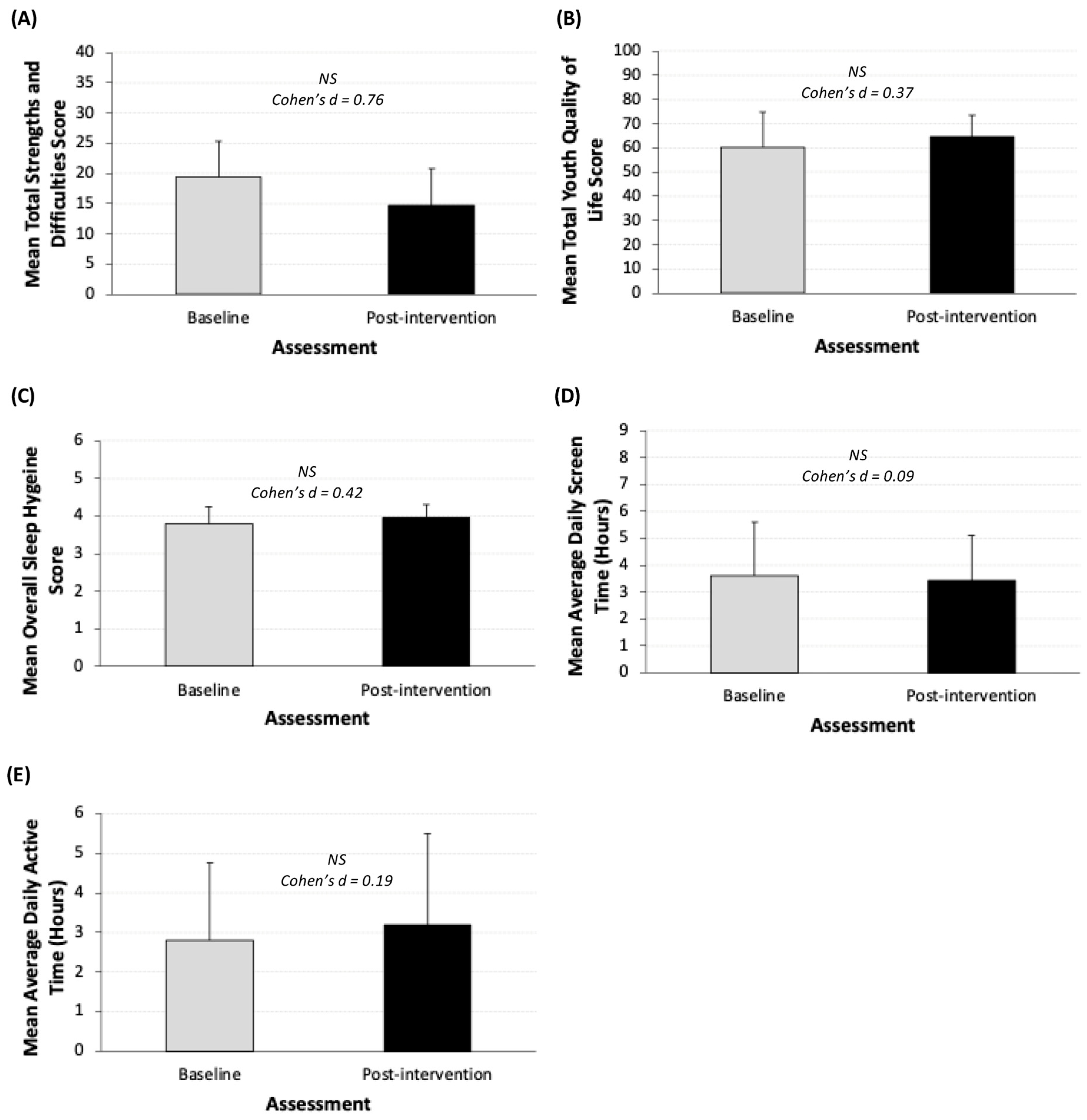 Figure 3. (AE). Pre- and post-intervention comparison of outcome measures (n = 10). (A) Strengths and difficulties (total SDQ) ; (B) youth quality of life; (C) sleep hygiene; (D) average daily screen time; (E) average daily active hours; error bars represent standard deviation. Asterisks represent level of significance (p > 0.1 = NS). Sample sizes vary across analyses due to incomplete assessment completion. Participants who did not complete a given assessment were excluded from the analyses for that outcome. One participant did not complete the final Strengths and Difficulties and Habitual Activity Estimation Scale questionnaires. Baseline scores for this participant were also omitted. Findings should be interpreted with caution due to the very small sample size.