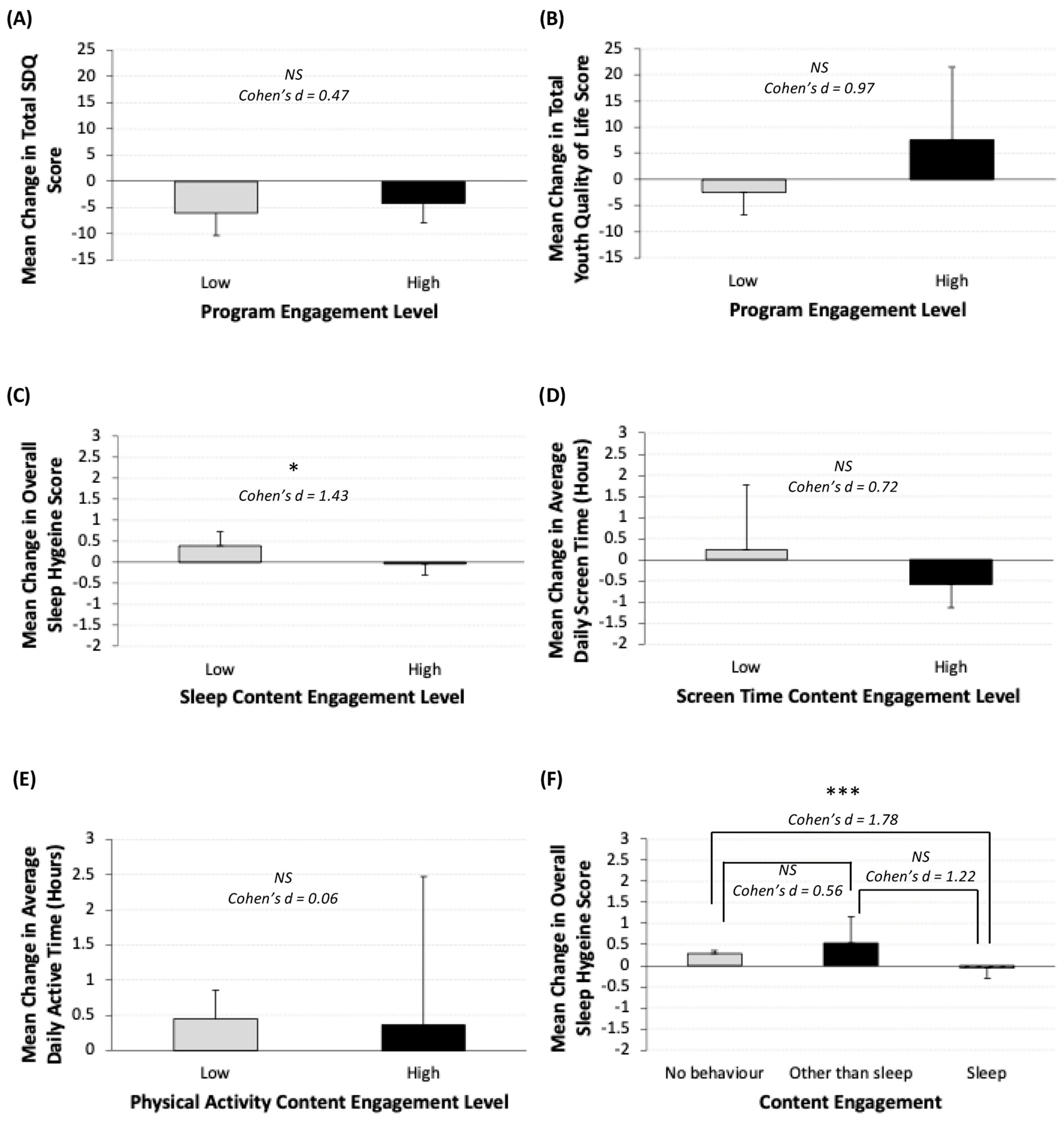 Figure 4. (AF) Intervention impact by level of virtual resource engagement. (A) Strengths and difficulties (total SDQ) (low: n = 2; high: n = 7); (B) youth quality of life (low: n = 3; high: n = 7); (C) sleep hygiene (low: n = 5; high: n = 5); (D) average daily screen time (low: n = 5; high: n = 5); (E) average daily active hours (low: n = 4; high: n = 5); (F) sleep hygiene based on engagement with no behaviors (n = 3), engagement with other behaviors (n = 2) and engagement with both sleep and other behaviors (n = 5). Error bars represent standard deviation. Asterisks represent level of significance (p > 0.1 = NS, p < 0.1 = *, p < 0.05 = ***). Sample sizes vary across analyses due to incomplete assessment completion. Participants who did not complete a given assessment were excluded from the analyses for that outcome. Findings should be interpreted with caution due to the very small sample size.