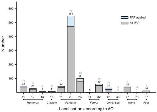 Histogram of fracture localization according to AO in the study population regarding application of PAP.