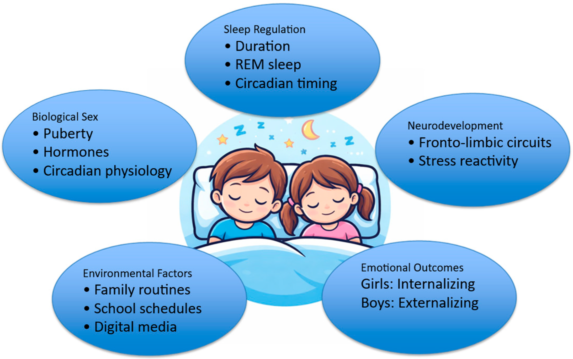 Growing evidence indicates that these processes do not unfold uniformly across sexes. Sex differences in sleep patterns and emotional outcomes become increasingly pronounced from late childhood through adolescence, coinciding with pubertal maturation and hormonal changes [
