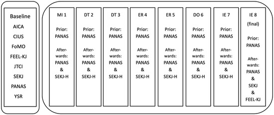 Figure 1 shows the assessment procedure: Before the start of the group therapy, participants were asked to fill in a baseline (BL) assessment, which they were asked to submit on the first day of the program. During each session, participants were asked to complete pre- and post-assessments. These tests were suitable for juveniles of that age and consisted of three pages. Each assessment took approximately 3–5 min. To minimize assessment burden and ensure high data quality among the adolescent participants, only brief, validated scales (PANAS, SEKJ-H) were used. As these scales were used consistently, participants became familiar with them, which further prevented survey fatigue within the 90-min session structure. This minimized assessment burden and allowed for quick completion before and after each session. At the end of the final session, three psychometric tests were administered.