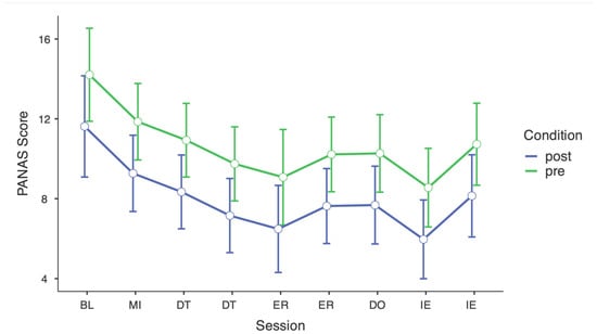 Linear mixed models were calculated for NE and PE with timepoint and condition (pre vs. post) as fixed effects. For negative affect (NE), the model explained 44.1% of the variance when random effects were included (conditional R2 = 0.441), with 7.3% explained by fixed effects (marginal R2 = 0.073). There was a significant main effect of timepoint, F(8, 520.8) = 3.32, p < 0.001, indicating a gradual decrease in NE from BL through the early sessions, with the largest reduction around the first IE module. NE scores were significantly lower at the final session compared to BL, t(31) = −2.64, p = 0.009. Across all sessions, NE was also significantly lower after each session than before, F(1, 512.3) = 25.94, p < 0.001, suggesting consistent short-term reductions in negative affect within sessions (see Figure 2).