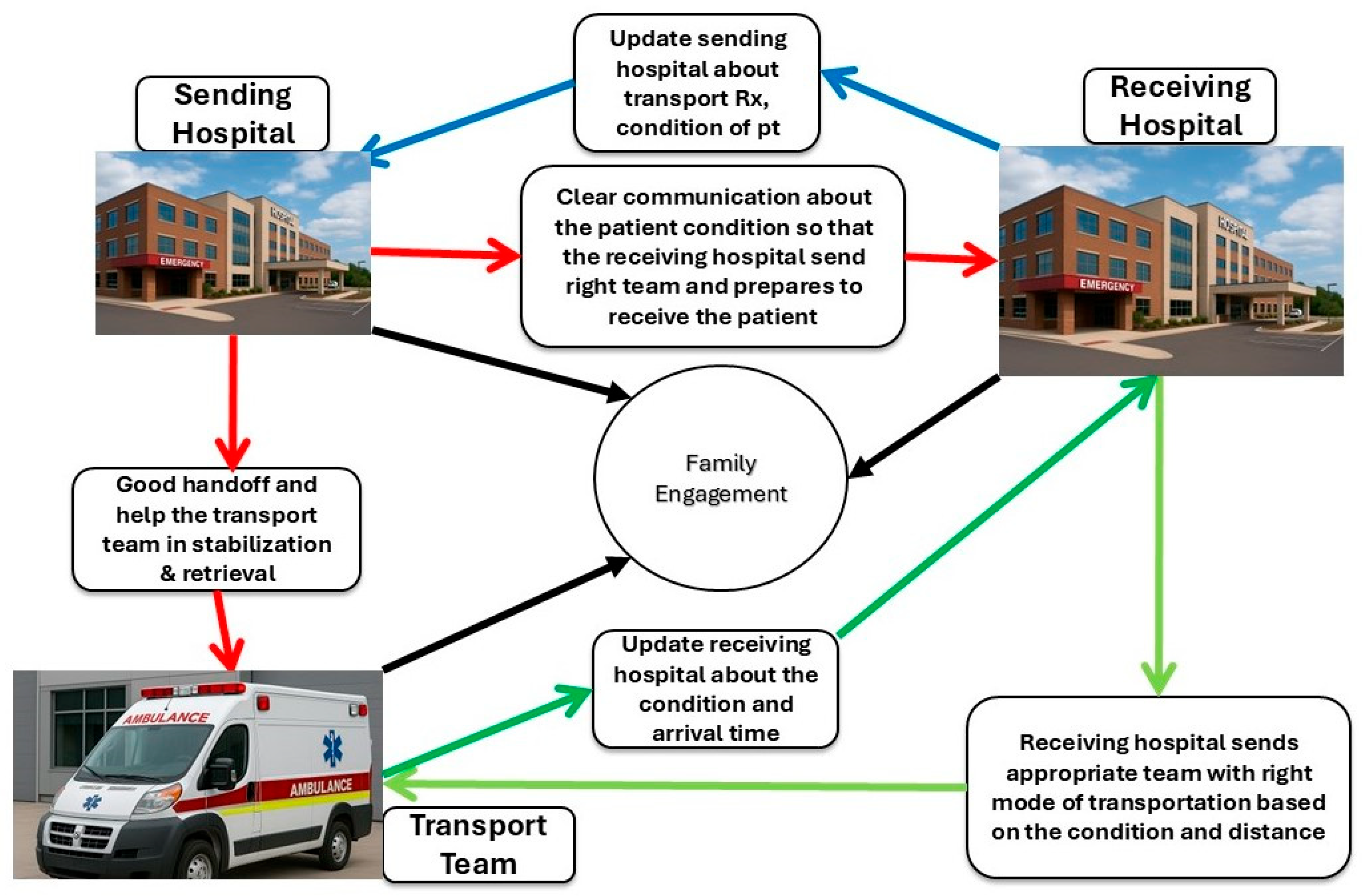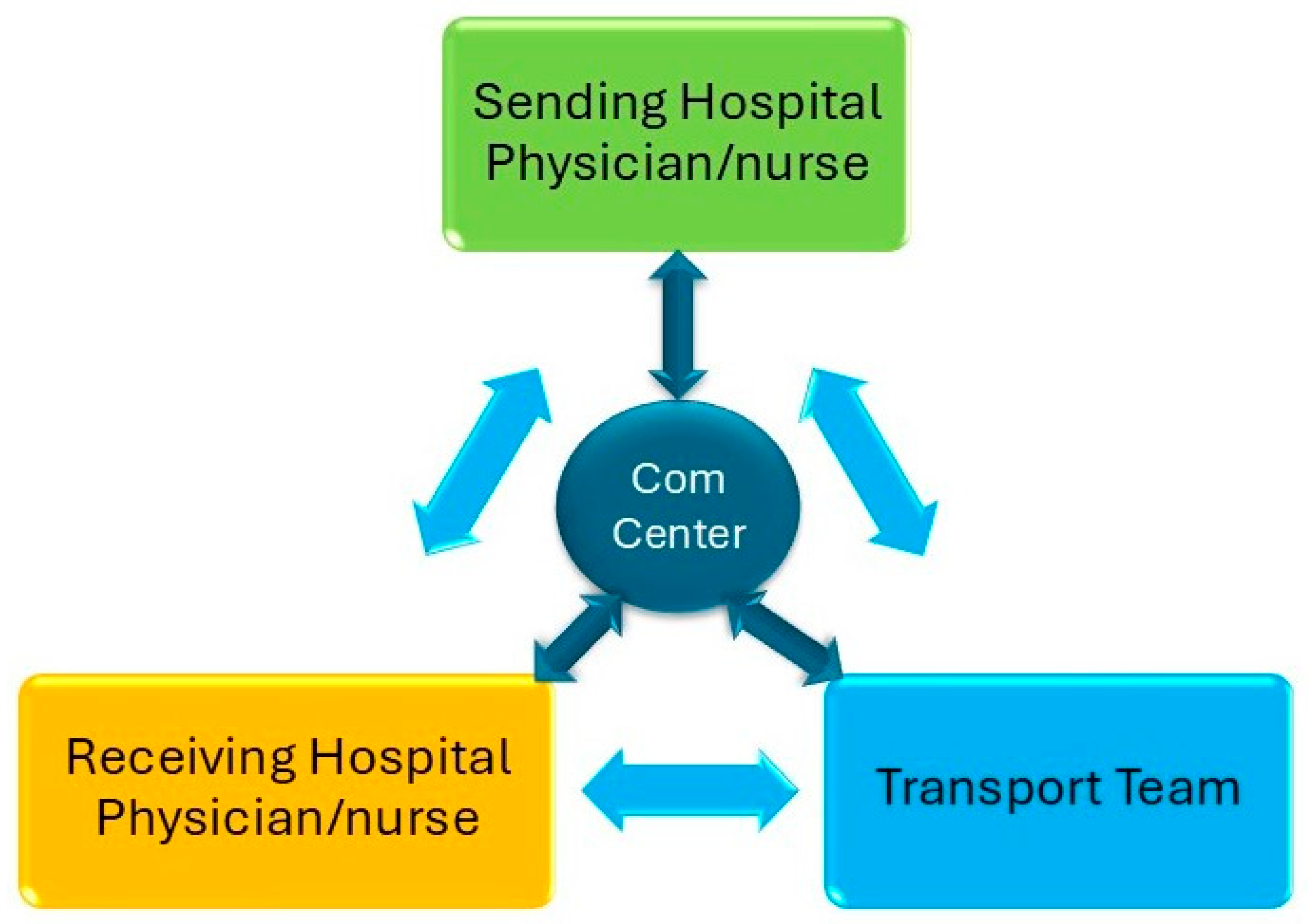 - Stroud, M.H.; Trautman, M.S.; Meyer, K.; Moss, M.M.; Schwartz, H.P.; Bigham, M.T.; Tsarouhas, N.; Douglas, W.P.; Romito, J.; Hauft, S.; et al. Pediatric and Neonatal Interfacility Transport: Results from a National Consensus Conference. Pediatrics 2013, 132, 359–366. [Google Scholar] [CrossRef]