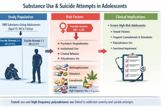 Tunagur, M.T.; Kurt Tunagur, E.M. Substance Use and Suicide Attempts in Adolescents: A Comparative Analysis of Clinical and Psychosocial Risk Factors. Children 2026, 13, 186. https://doi.org/10.3390/children13020186