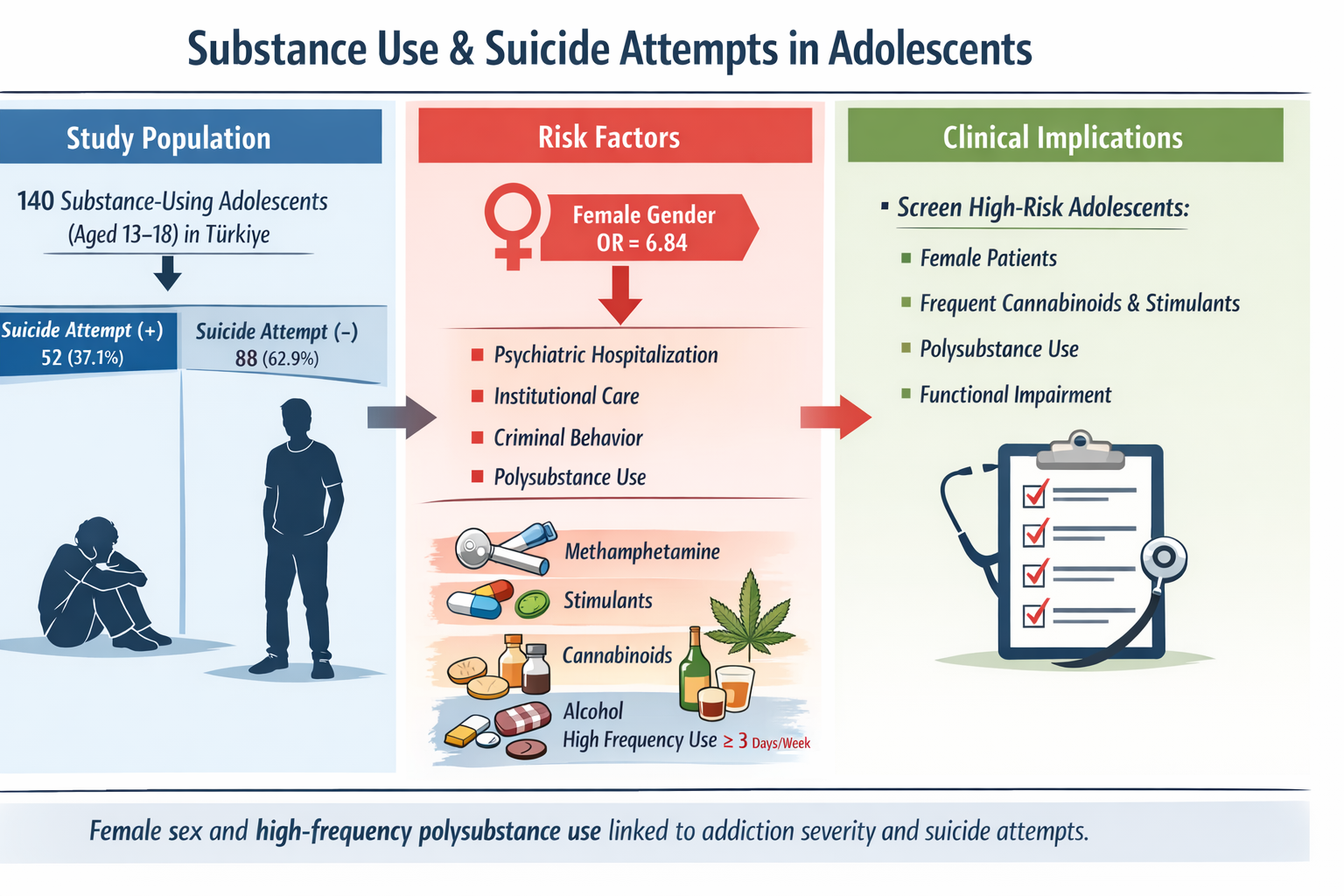 Inclusion criteria were: (i) age between 12 and 18 years, (ii) presentation to the ÇEMATEM outpatient clinic between March 2023 and February 2025, and (iii) availability of sufficient clinical and sociodemographic information in the medical records to assess substance use characteristics and history of suicide attempts.
