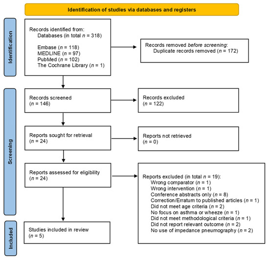 The initial search identified 318 studies. After the removal of 172 duplicates, 146 unique articles remained. These were screened by title and abstract, resulting in the exclusion of 122 articles that did not use IP or did not focus on asthma or wheeze. Full-text assessment was performed on the remaining 24 articles, of which 19 were excluded because they did not meet the age criteria, did not focus on IP, were conference abstracts, or had outcomes, settings or comparators that did not align with the predefined inclusion and/or exclusion criteria.