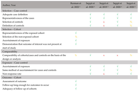 The Newcastle–Ottawa Scale for assessing risk of bias. Symbols: √ = criterion fulfilled, x = criterion not fulfilled, % = not applicable. References: 1 [16], 2 [11], 3 [15], 4 [17], 5 [18].