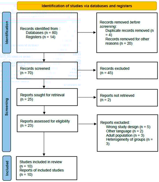 In total, 94 records were identified through the initial database search. After removal of duplicate records (n = 4) and clearly irrelevant studies (n = 20), 70 abstracts were screened. Of these, 47 records were excluded because they consisted of systematic reviews, meta-analyses, narrative reviews, books, or conference abstracts. The remaining 23 full-text articles were assessed for eligibility, and an additional 13 were excluded for not meeting the predefined inclusion criteria. Ultimately, 10 studies were deemed eligible and included in the systematic review [15,16,17,18,19,20,21,22,23,24].