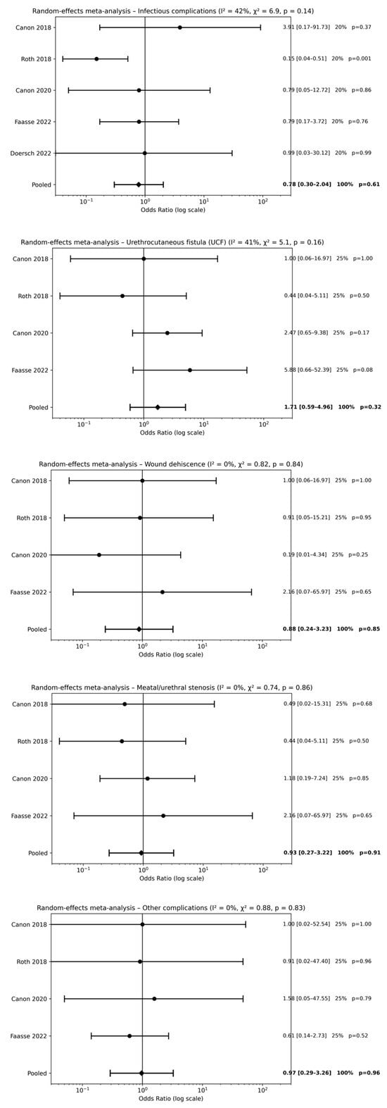 When combined pre- and postoperative antibiotics were compared with postoperative antibiotics alone, a significant reduction in UCF (OR 0.43, 95% CI 0.23–0.82; p = 0.008) and other complications (OR 0.25, 95% CI 0.06–1.02; p = 0.04) was observed, whereas no significant differences were found for infectious complications, wound dehiscence, or meatal/urethral stenosis. Although statistical significance was observed for “other postoperative complications” in selected analyses, these findings should be interpreted with caution. The very low number of events, heterogeneity in outcome definitions, and marginal CIs substantially limit the robustness and clinical relevance of this result. Accordingly, this outcome should be considered exploratory rather than indicative of a meaningful protective effect of perioperative antibiotic therapy.