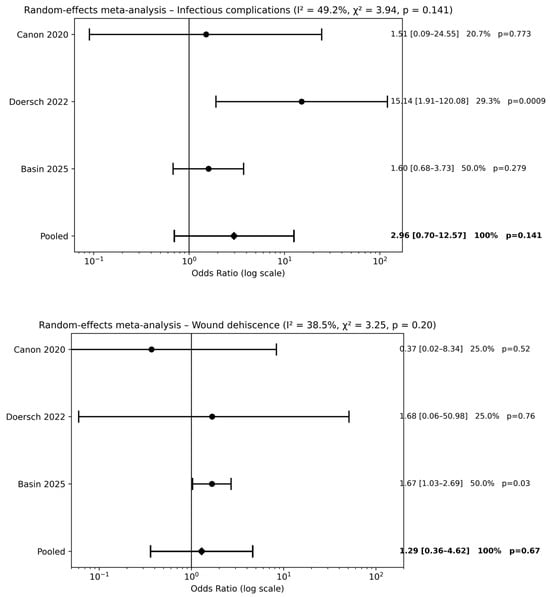Three studies [20,22,24] evaluated preoperative antibiotic prophylaxis alone compared with no antibiotic use. Meta-analysis did not demonstrate a significant reduction in postoperative complications for infectious complications [pooled OR 2.96, 95% CI 0.70–12.57; p = 0.14] or wound dehiscence [pooled OR 1.29, 95% CI 0.36–4.62; p = 0.67] (Figure 3). Across outcomes, pooled effect estimates were close to unity, and CIs consistently crossed the line of no effect, indicating the absence of a measurable protective effect of preoperative antibiotic prophylaxis alone compared with no antibiotics.