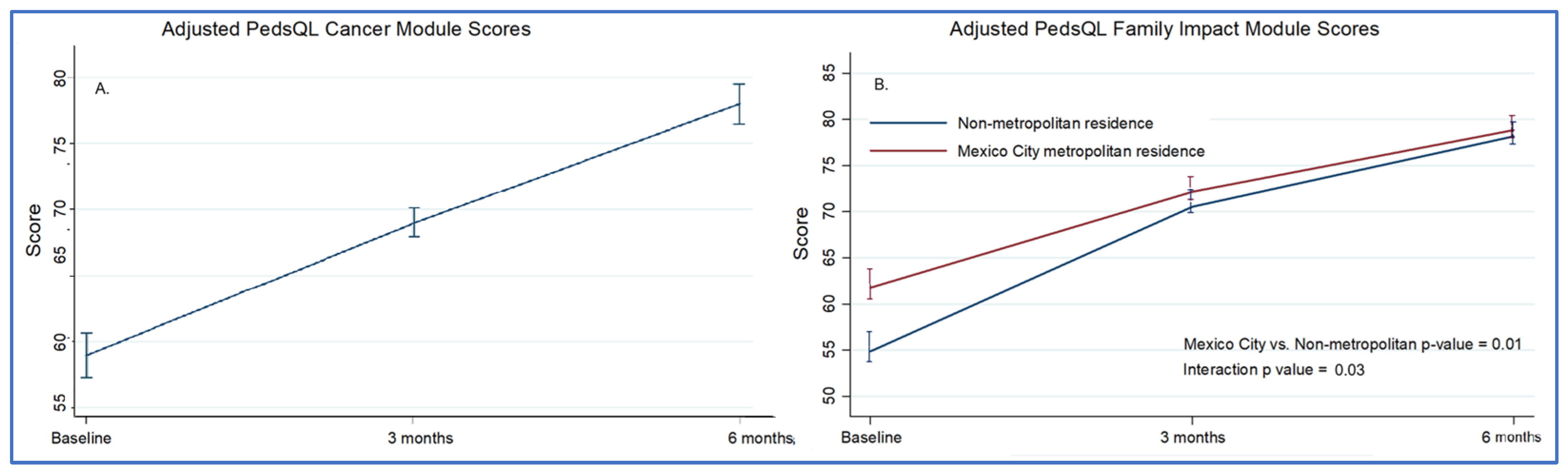 Table S2, Figure S4). Families of children in the age group of 5–7 years had lower scores over time (adjusted difference: −8.1, 95% CI: −15.9 to −3.8), as did those with an oncologic diagnosis (adjusted difference: −13.0, 95% CI: −19.6 to −6.3) and families living outside the Mexico City metropolitan area (adjusted difference: −8.6, 95% CI: −14.7 to −2.6). There was a significant interaction between time and location of residence, indicating a higher rate of improvement among families living in non-metropolitan areas (