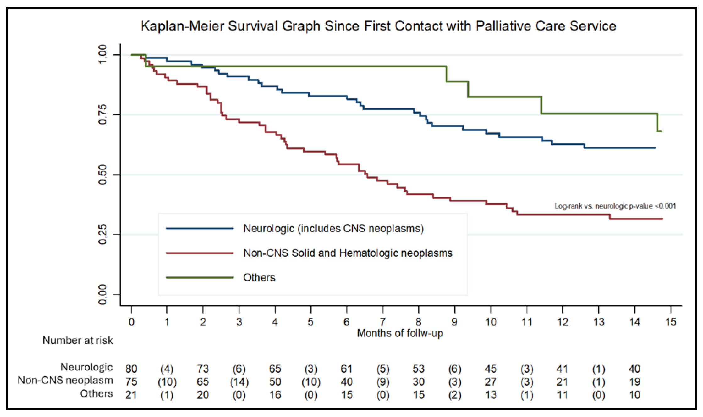 Figure 2 presents the Kaplan–Meier survival curve. Median survival was 11.4 months for the overall cohort, 6.5 months for patients with non-CNS solid or hematologic neoplasms, and 29 months for patients with neurologic conditions, including CNS neoplasms. Most patients (68.7%) died at home, while the remainder died in the hospital. No significant associations were observed between diagnosis, place of residence, or socioeconomic status and the place of death.