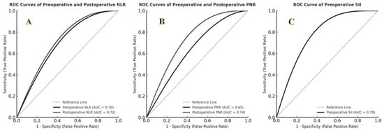 ROC curves for predicting mortality using hematologic indices. (A) ROC curves of preoperative and postoperative NLR (AUC = 0.70 and 0.72, respectively). (B) ROC curves of preoperative and postoperative PNR (AUC = 0.65 and 0.74, respectively). (C) ROC curve of preoperative SII (AUC = 0.78).
