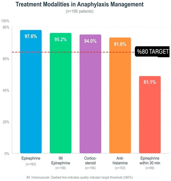 Treatment modalities in anaphylaxis management (n = 166): epinephrine, IM epinephrine, corticosteroid, antihistamine, epinephrine within 30 min. Dashed line: ≥80% target; IM: intramuscular.