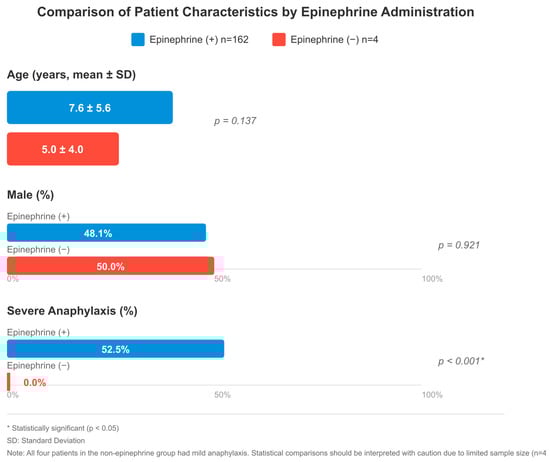Comparison of patient characteristics by epinephrine administration: age (mean ± SD), male (%), and severe anaphylaxis (%). The epinephrine-treated group included 162 patients; severity was assessable in 160, of whom 85 (53.1%) had severe anaphylaxis. Two patients had incomplete severity data. All four patients in the non-epinephrine group had mild anaphylaxis; no severe cases were present in this group. * p < 0.05 indicates statistical significance. SD: standard deviation. Note: Statistical comparisons involving the non-epinephrine group (n = 4) should be interpreted with caution due to limited sample size.