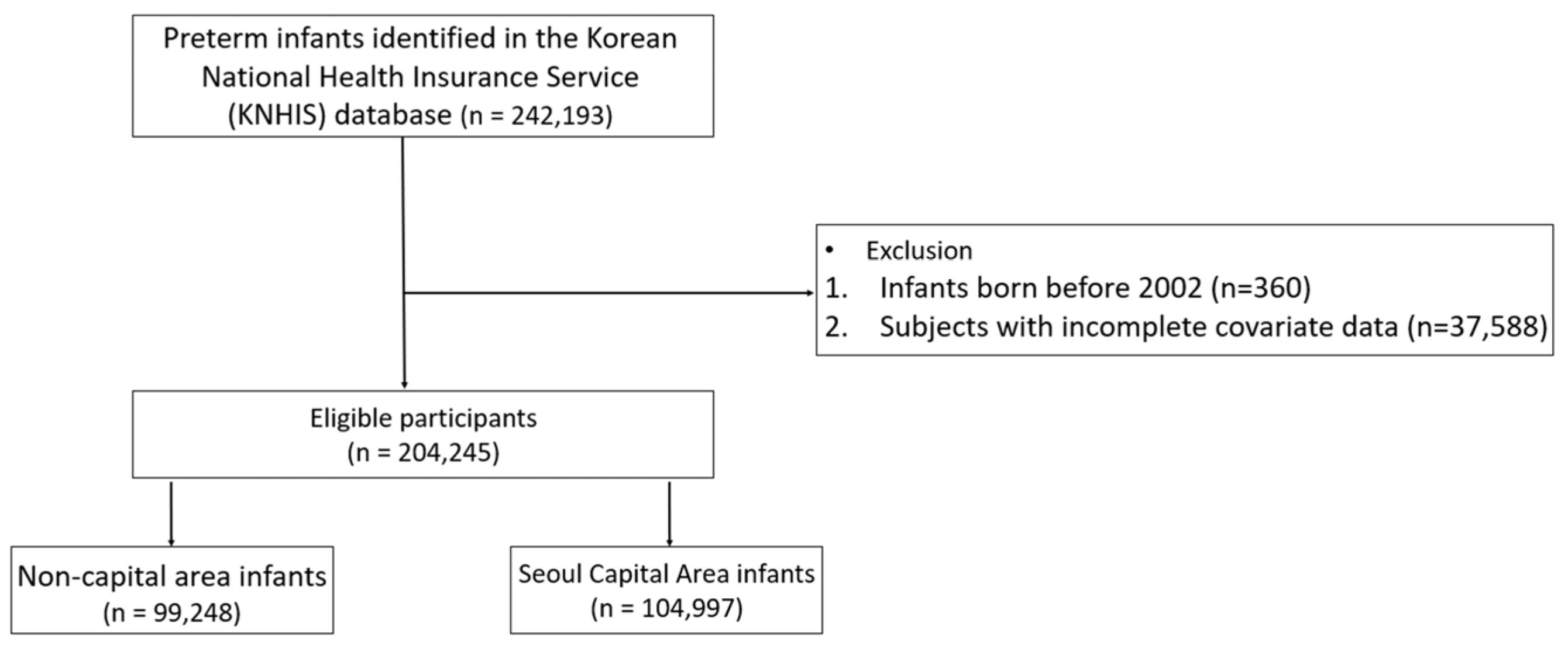 | Non-Capital Area Infants (N = 99,248) | Seoul Capital Area Infants (N = 104,997) | p Value | |