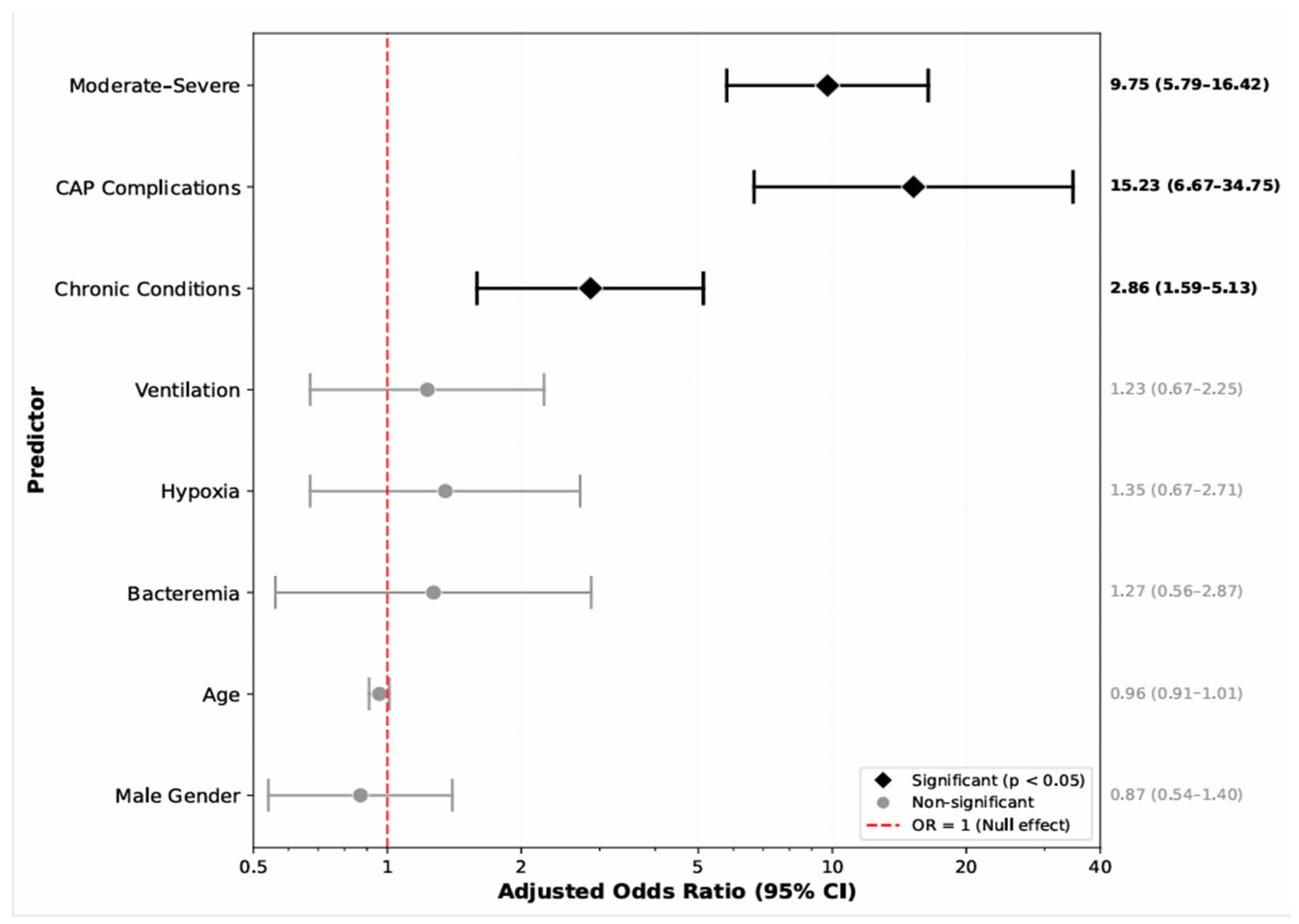 - Disease severity, pneumonia complications, and chronic medical conditions independently predict prolonged hospitalization (≥10 days) in 27.5% of children with community-acquired pneumonia.