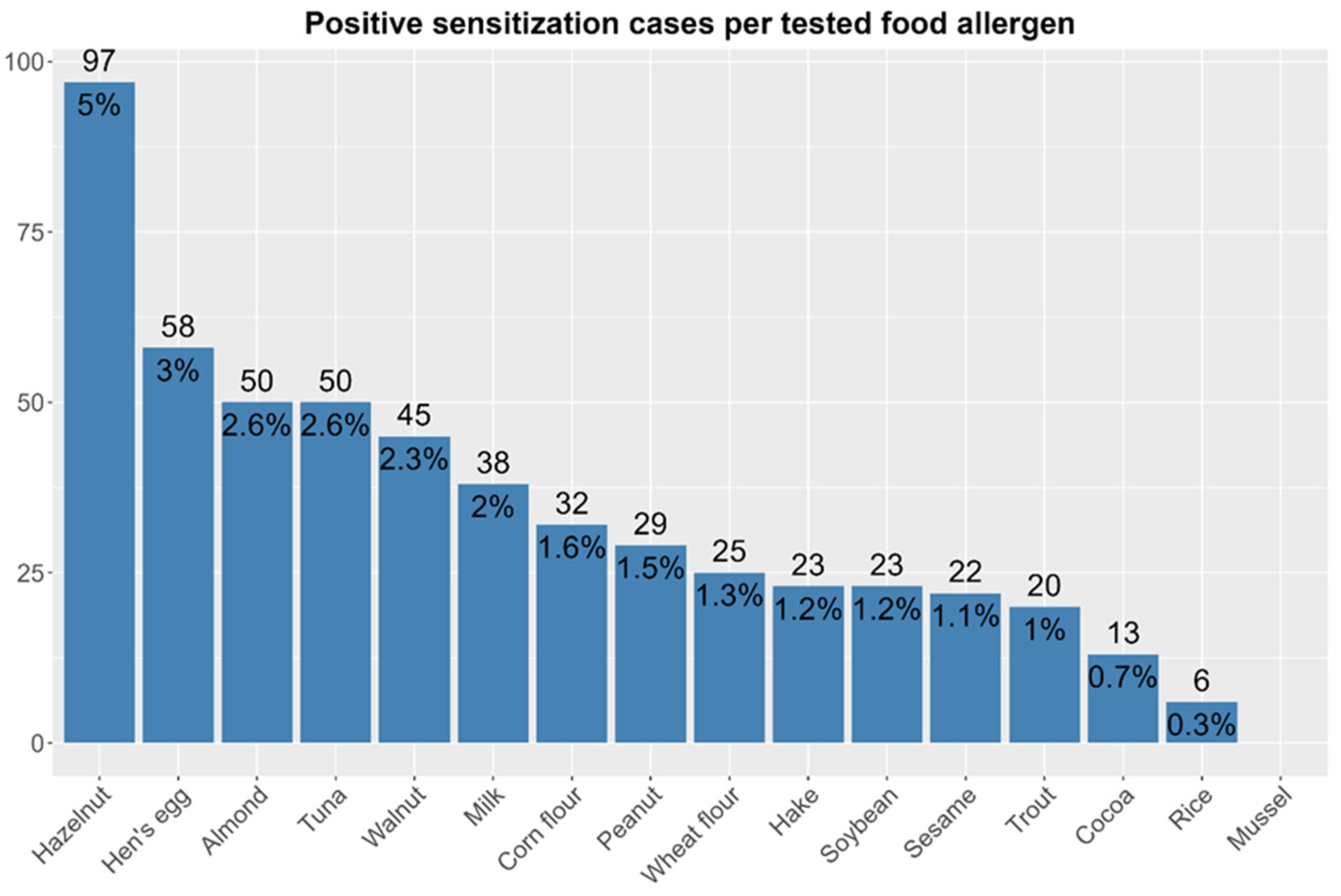 Hazelnut was the most common sensitizer, affecting 5% of the children. Other tree nuts, such as almond (2.6%) and walnut (2.3%), also ranked high, suggesting that tree nuts represent a major allergen source. This aligns with patterns observed in Europe, where tree nuts and hen’s egg are one of the most common triggers of allergy in early life [
