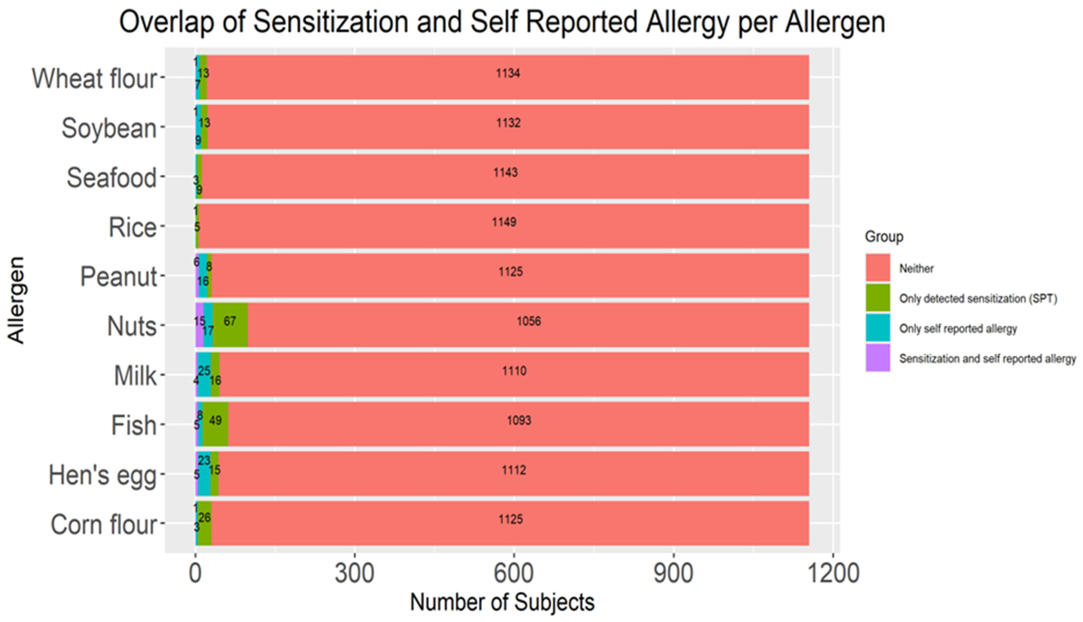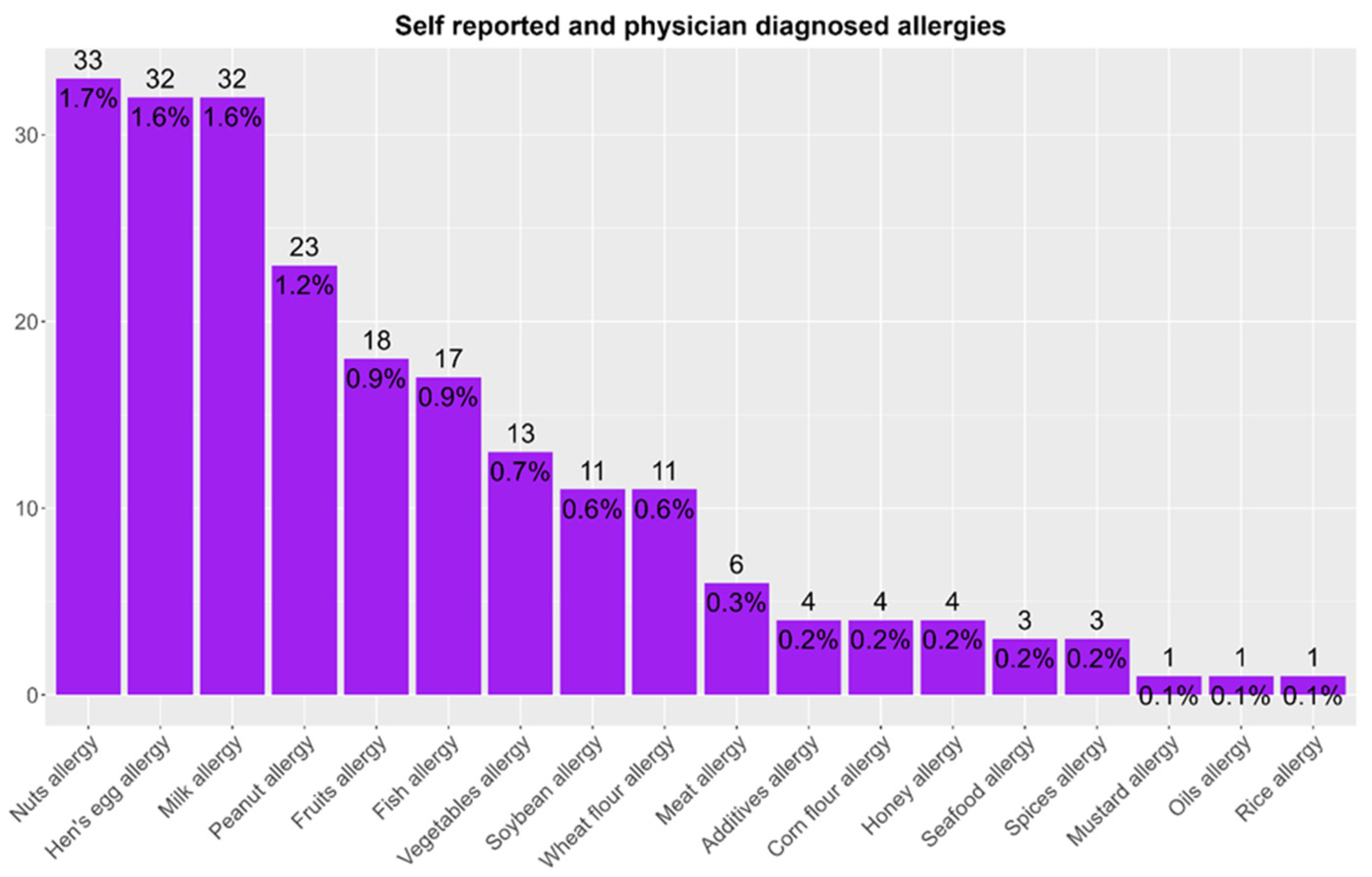 The sensitization rates for hen’s egg and milk were the second and third highest documented in this study (3% and 2%, respectively), while the self-reported allergy to hen’s egg and milk (both 1.6%) along with physician-diagnosed allergy to hen’s egg and milk prevalence rates were also in the top three reported (both 0.2%). Interestingly, the sensitization rate to peanut was lower compared with other food allergens such as cow’s milk, hen’s egg, nuts, and fish (1.5%). However, self-reported and physician-diagnosed peanut allergy prevalence rates were among the highest (1.9% and 0.13%, respectively). This discrepancy could be the result of heightened awareness among healthcare providers regarding the risks associated with peanut allergy, which is often linked to severe reactions and is, therefore, more likely to be diagnosed and reported [