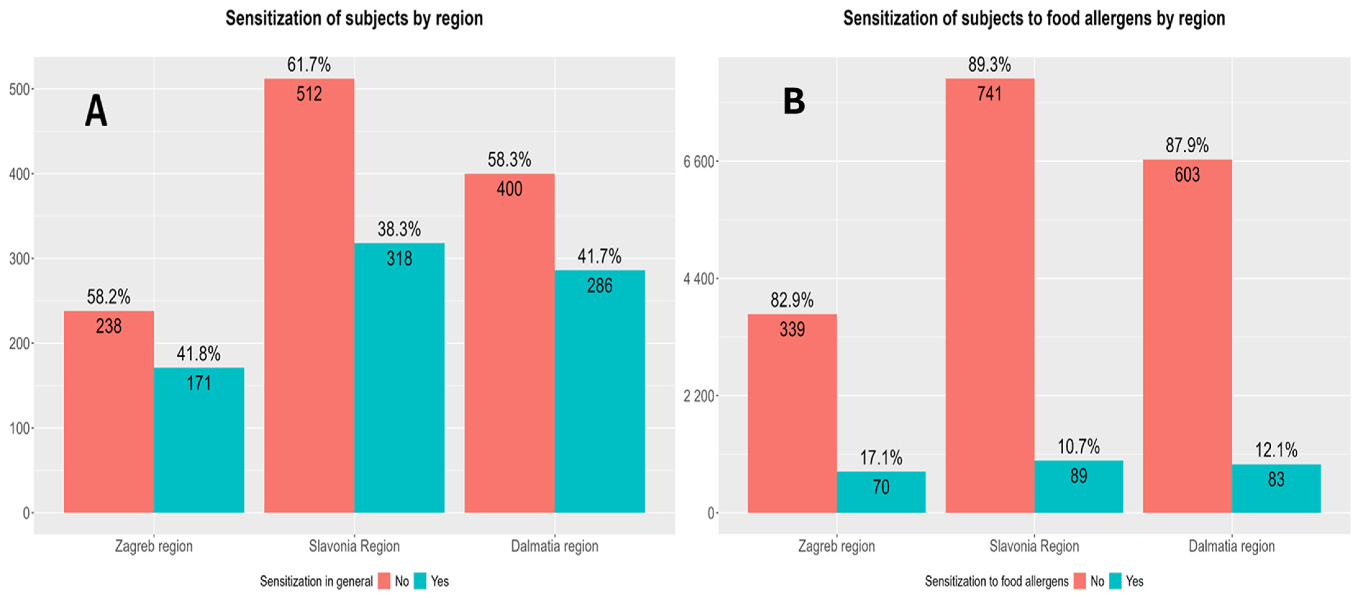 While the overall sensitization rates were comparable across the three investigated regions, with Zagreb and Dalmatia showing nearly identical frequencies (41.7% and 41.8%, respectively) and Slavonia showing a slightly lower one (38.3%), when focusing on food allergens, regional disparities were more evident. Sensitization rates to food allergens were higher in the Zagreb region (17.1%) compared with Dalmatia (12.1%) and Slavonia (10.7%). This finding may suggest that dietary habits, urban lifestyle, or other region-specific environmental exposures are more different and more pronounced in the Zagreb area, increasing the risk for allergic sensitization [