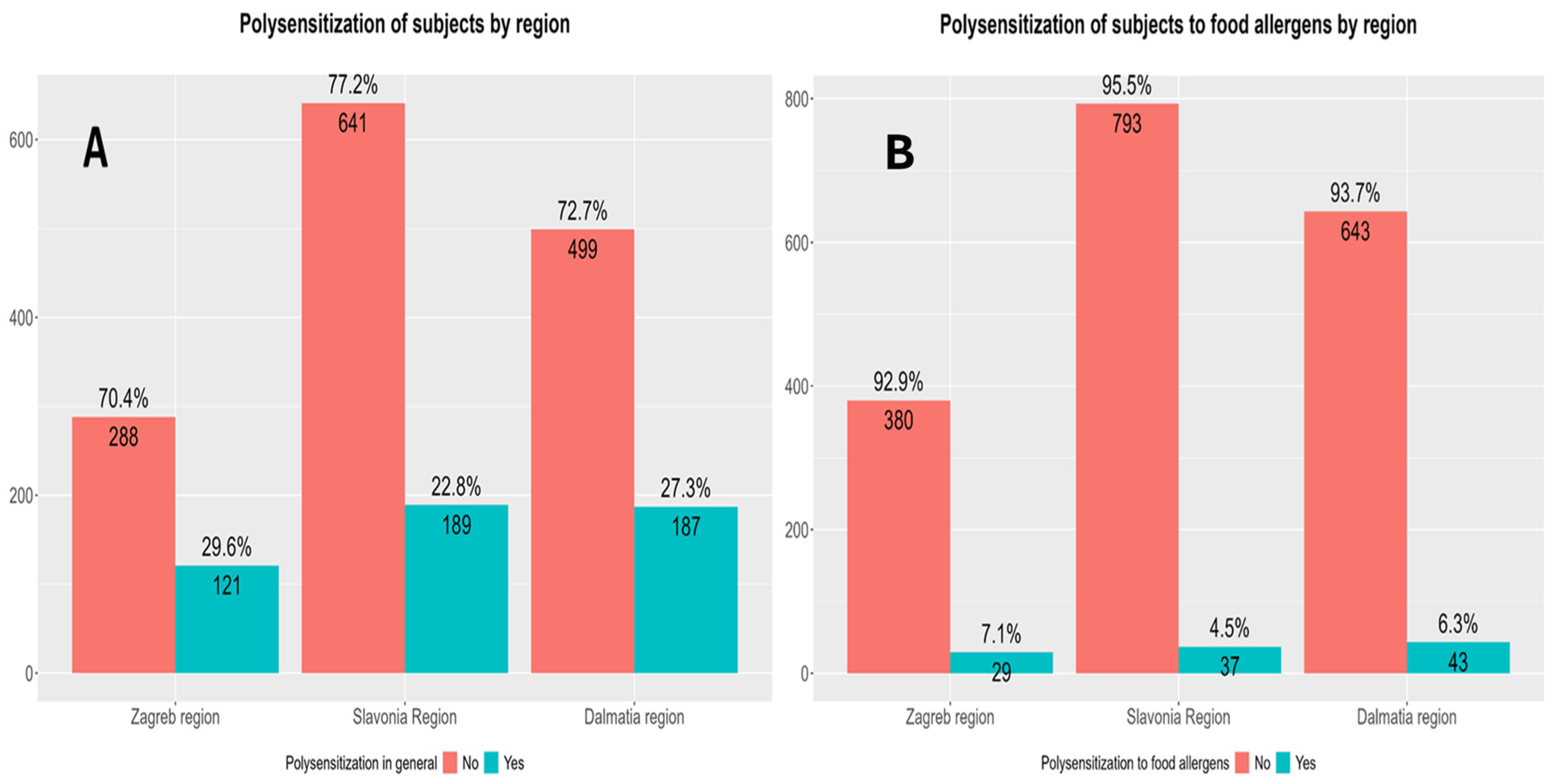 General polysensitization rates also showed statistically significant variation across tested regions, with the highest rate documented in the Zagreb region (29.6%) and the lowest in Slavonia (22.8%). This trend may point to a greater cumulative sensitization burden in urban or more industrialized areas. Contrary to general polysensitization, polysensitization rates to food allergens did not differ significantly across regions. Nevertheless, the consistently higher polysensitization rates in Zagreb and Dalmatia suggest a potential influence of local dietary habits and exposure patterns [