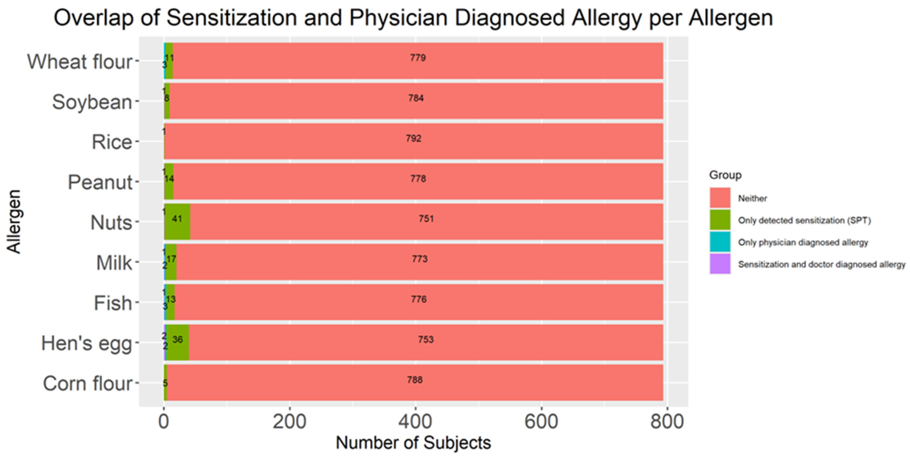 58]. The agreement between SPT results and confirmed diagnosis of food allergy was even lower than that with self-reported allergy (κ = 0.13), with sensitivity being 9% and specificity of 99%, which indicates that nearly all non-sensitized children were correctly classified as non-allergic, but at the same time, most sensitized children lacked a formal diagnosis. Only 1.1% of preschoolers were both sensitized and had a physician-diagnosed food allergy. The global odds ratio showed that sensitized children were over eleven times more likely to have a clinically relevant food allergy compared with non-sensitized peers. For several allergens—including soybean, peanut, nuts, corn, and rice—no physician-diagnosed allergies were reported in non-sensitized children, resulting in infinite odds ratios, suggesting perfect but rare concordance within this small sample.