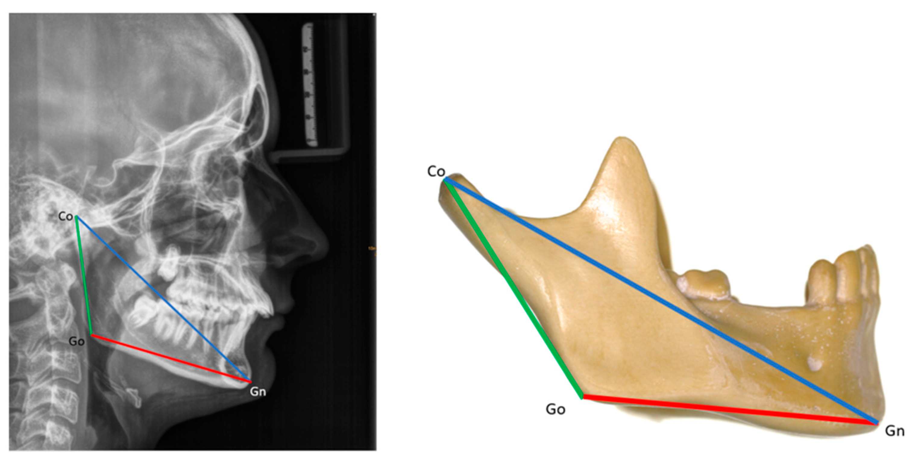 25]. The following measures were taken: total mandibular length (Co-Gn), ramal length (Co-Go), body length (Go-Gn), and the ramal-to-body length ratio (Co-Go/Go-Gn) (see the