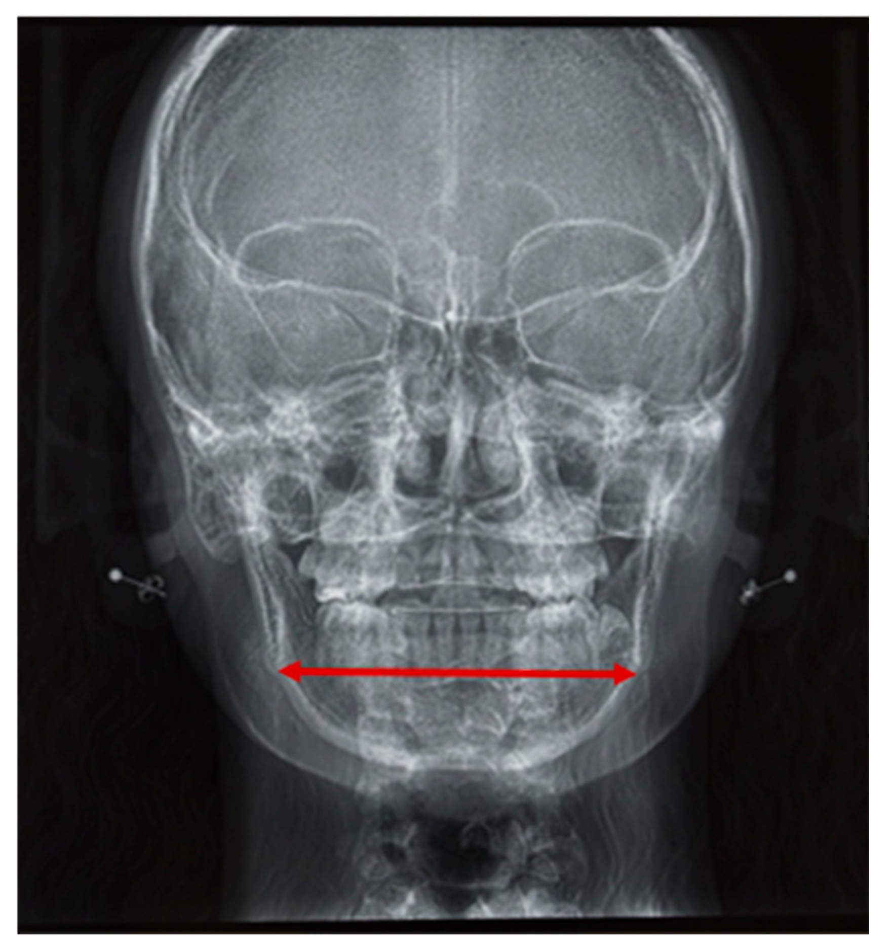 Mandibular width was determined by measuring the distance between the two antegonial notches on frontal cephalometric radiographs. Age-dependent reference values were used for this analysis (analysis according to Ricketts [