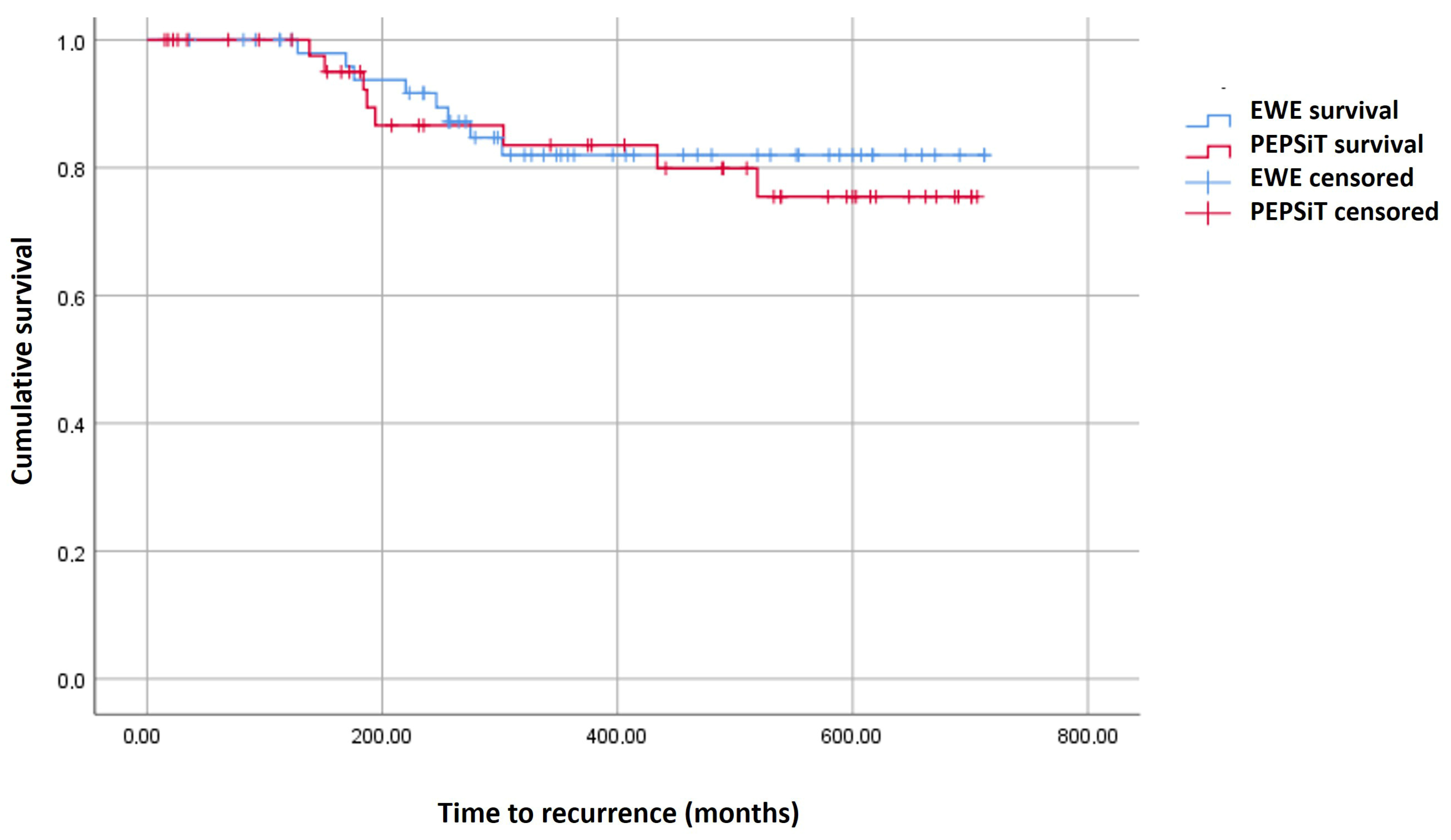 Finally, during long-term follow-up, a total of 16 recurrences (15.7%) were observed, with a median time of 19 months (IQR 10–24). Recurrences occurred in 8 patients from each group (14.8% in the EWE group and 16.7% in the PEPSiT group,