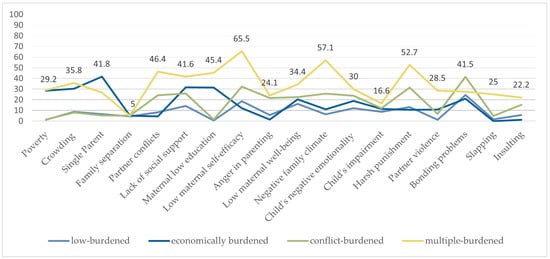 Latent class analysis was used to identify patterns of co-occurring psychosocial risk characteristics based on 18 indicators for parenting difficulties, developmental problems, or child welfare risks [25,26]. The AID:A 2019 study provided the basis for the data. Missing data were handled using full information maximum likelihood. Model selection considered several fit indices, with the four-class solution showing the most favorable balance of fit and parsimony according to the BIC. Details on the analyses are described elsewhere [33]. Latent class membership was used as a grouping variable for descriptive summaries and exploratory regression analyses conducted outside the latent class model. The four groups are a multiple-burdened group (4.7%), a low-burdened group (62.1%), and two medium risk groups: a group with a higher socioeconomic burden (15.7%) and a group with a higher level of parenting stress and conflict potential (17.6%). The group with parenting stress and conflict reported characteristics such as low maternal self-efficacy, anger in parenting, harsh parenting, and partner conflicts. In comparison, the economically disadvantaged group showed increased characteristics such as an elevated risk of poverty, living in cramped housing conditions, or low education. While the group of low-burdened families could hardly be characterized by any of these characteristics, the group of multiple-burdened families featured nearly all risk factors.