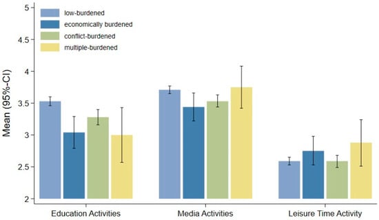 Figure 3 displays mean levels (with 95% confidence intervals) of parental involvement in the three HLE activities of education, media, and leisure time across the four risk groups. All burdened families showed significantly fewer educational activities than the low-burdened families. Regarding media activity, all groups show generally lower involvement, but economically and multiple-burdened families exhibit higher engagement compared to the other groups. However, ANOVA post hoc tests were not significant. On the right of Figure 3, the data reveal that stress-and-conflict-burdened families shared significantly fewer leisure-time activities than low-burdened families. In contrast, multiple-burdened families display levels that largely converge with the economically burdened group, though multiple-burdened families show consistently elevated variability.
