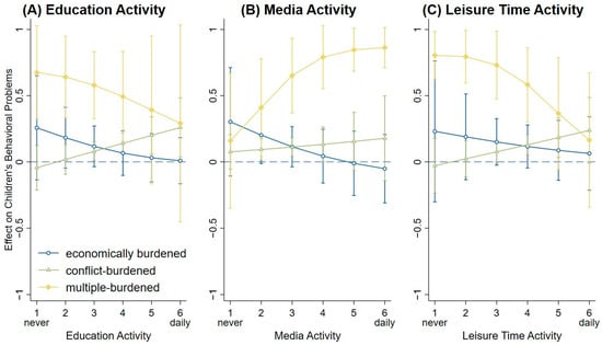 Figure 4 displays the average marginal effects (AMEs) of shared family activities on the predicted probability of children’s behavioral problems across psychosocial risk patterns. Across the three domains—educational activity, media activity, and leisure-time activity—the AMEs for economically burdened families are relatively small and do not differ statistically significantly from those of the low-burdened reference group. The associations are comparable in magnitude to those observed in families experiencing parenting stress and conflict, where children exhibit higher predicted probabilities of behavioral problems than those in the low-burden reference group, as indicated by positive AMEs. For this group, the AMEs tend to increase slightly with more shared family time activities, although only some of these differences reached statistical significance. Children from multiple-burdened families consistently show the largest positive AMEs across all activity domains, indicating the highest predicted probabilities of behavioral problems. In two of the three domains—educational and leisure-time activities—the AMEs decrease significantly with increasing shared family time, suggesting a lower level of behavioral problems. An exception is family media activity, which is associated with significantly higher behavioral problems in multiple-burdened families. A sub-analysis of individual media items did not yield statistically significant results for this group, likely due to the small sample size. Further details can be found in Table S3.