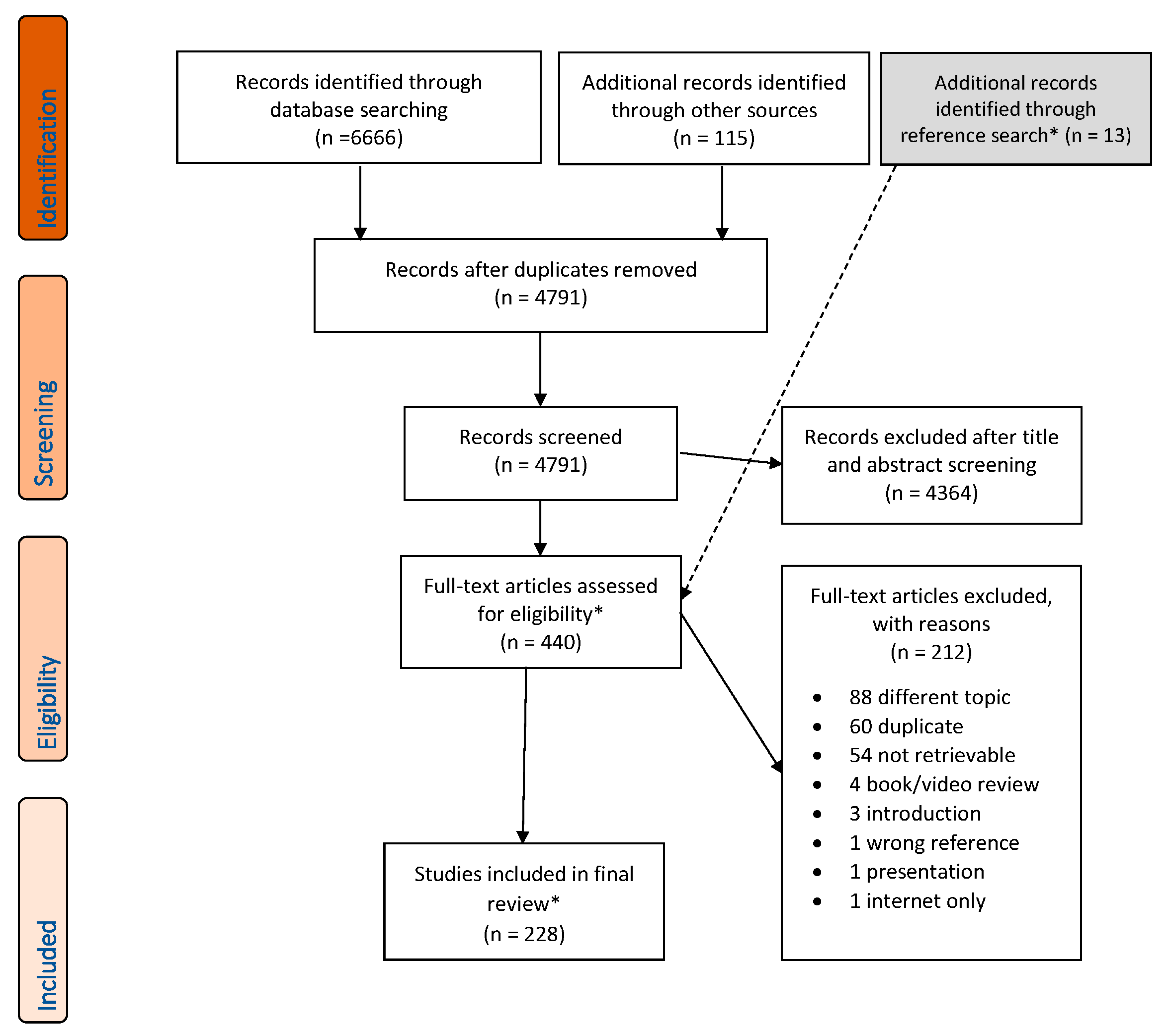 - Peters, M.D.J.; Marnie, C.; Tricco, A.C.; Pollock, D.; Munn, Z.; Alexander, L.; McInerney, P.; Godfrey, C.M.; Khalil, H. Updated methodological guidance for the conduct of scoping reviews. JBI Evid. Synth. 2020, 18, 2119–2126. [Google Scholar] [CrossRef]