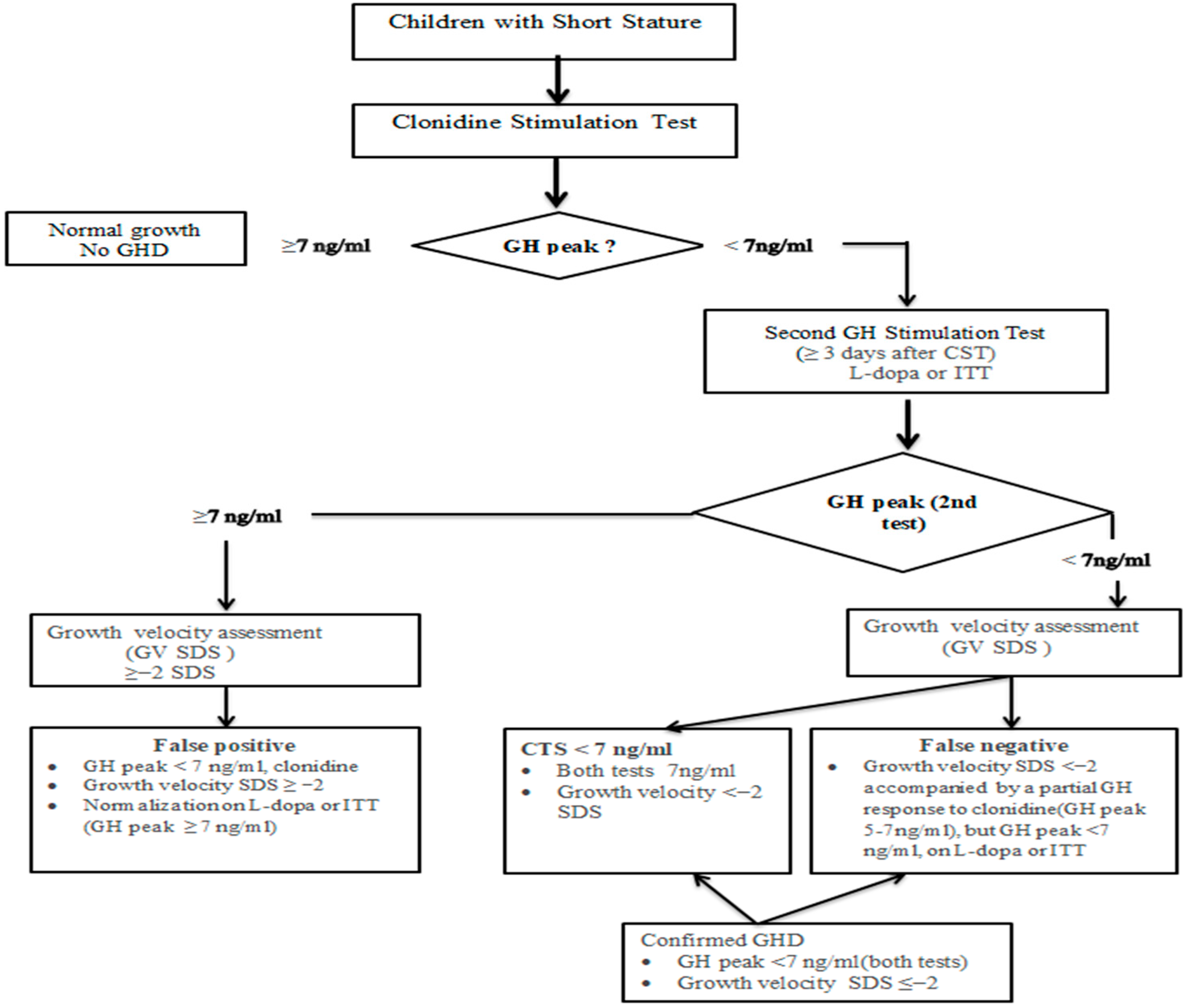 Participants were classified as false negatives when clinical indicators strongly supported GHD but biochemical testing yielded borderline CST results (growth velocity SDS < −2 or annual height gain < 4 cm (consistent with clinical GHD)), accompanied by a partial GH response to clonidine (GH peak: 5–7 ng/mL) but a GH peak of <7 ng/mL for L-dopa or the ITT. The diagnostic algorithm is shown in