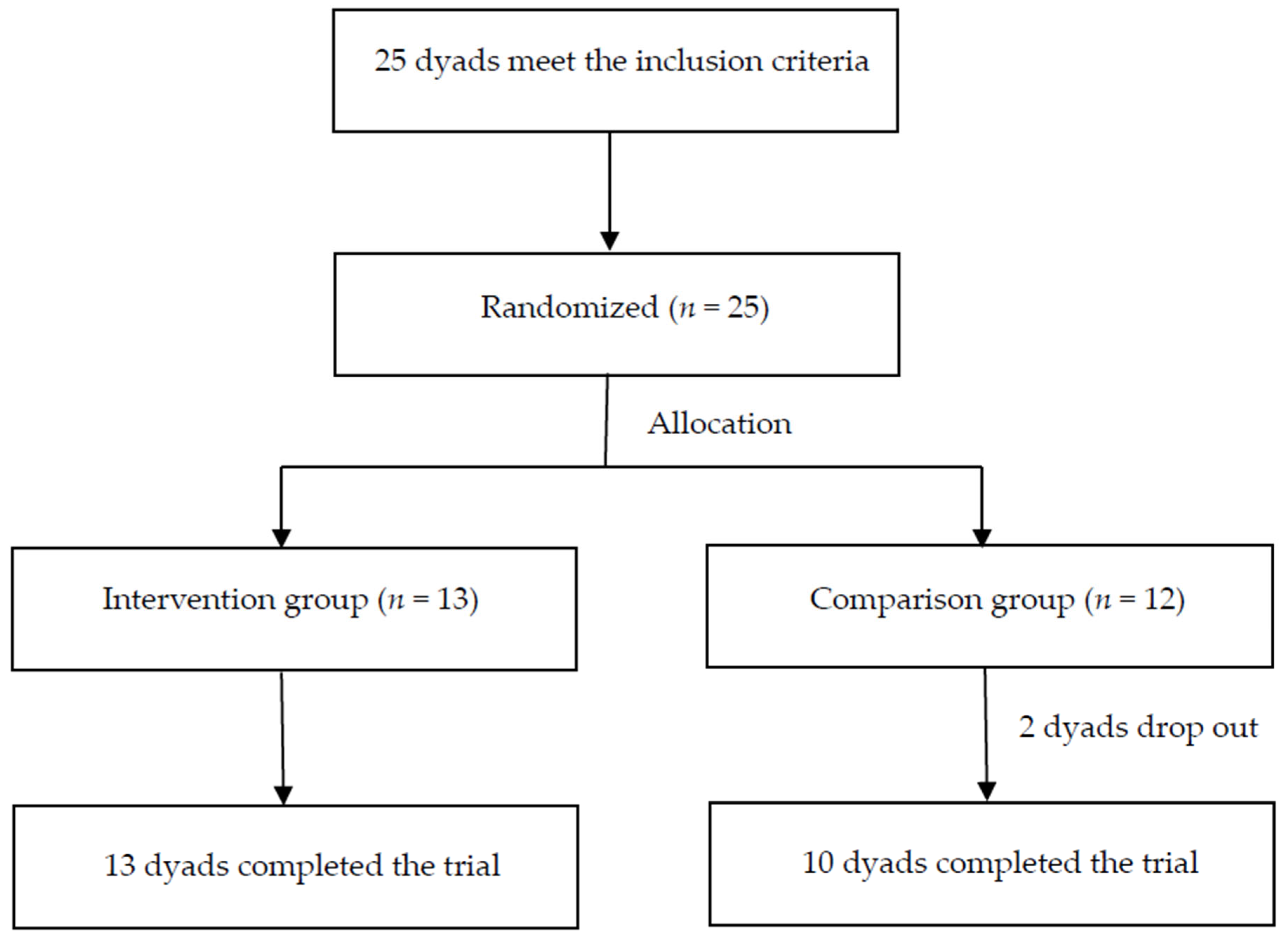 The participants were randomly assigned to the intervention group or the comparison group by using a random number table. Thirteen groups comprised the intervention group, and 12 groups comprised the comparison group, with the individual groups consisting of the children and their main caregivers. In the first week of the research, two comparison groups dropped out due to the influence of the COVID-19 pandemic. After 8 weeks of intervention, 13 intervention groups and 10 comparison groups participated in the posttest. The study flowchart is presented in