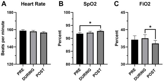 Comparison of cardiorespiratory variables before, during and after HFJV-KC. (A) Heart rate, n = 93. (B) SpO2—oxygen saturation by pulse oximetry, n = 93. (C) FiO2—fractional inspired oxygen on HFJV, n = 84. PRE—Before initiation of HFJV-KC (infant in incubator). DURING—30 min into performance of HFJV-KC. POST—after completion of HFJV-KC (infant returned to incubator). * p < 0.05.