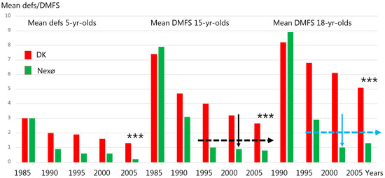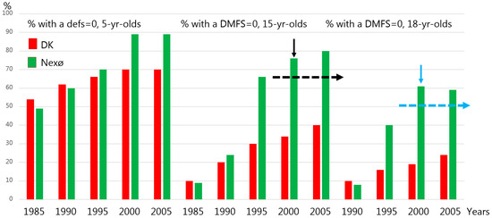 Results: The mean defs/DMFS or percentage of children with a defs = 0/DMFS = 0 in Nexø was, prior to the implementation of the Nexø method (before 1987), at the national level or worse. The mean defs/DMFS dropped significantly (