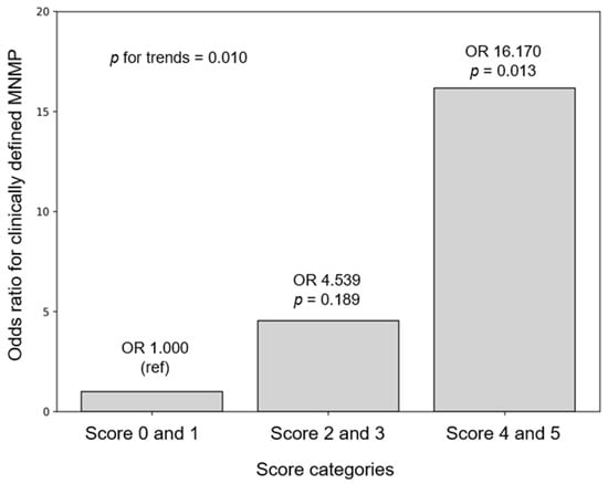 Odds ratios (ORs) for MNMP according to the number of serum inflammatory biomarkers. The score is the number of increased biomarkers according to the cut-off levels.