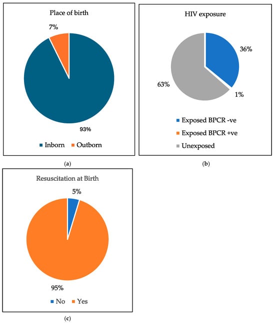 The pie charts of: (a) The place of birth. (b) HIV exposure. (c) Resuscitation at birth.