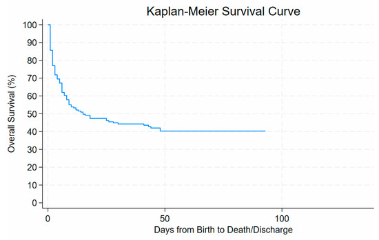 The Kaplan–Meier survival analysis demonstrated a steep decline in survival probability within the first few days after birth, with overall survival decreasing from 100% at day 0 to approximately 70% by day 10 of life. Survival declined gradually thereafter, reaching around 50% by day 30 of life and stabilising at approximately 40% beyond day 50. No further deaths occurred after about 90 days from birth until discharge. See Figure 5.