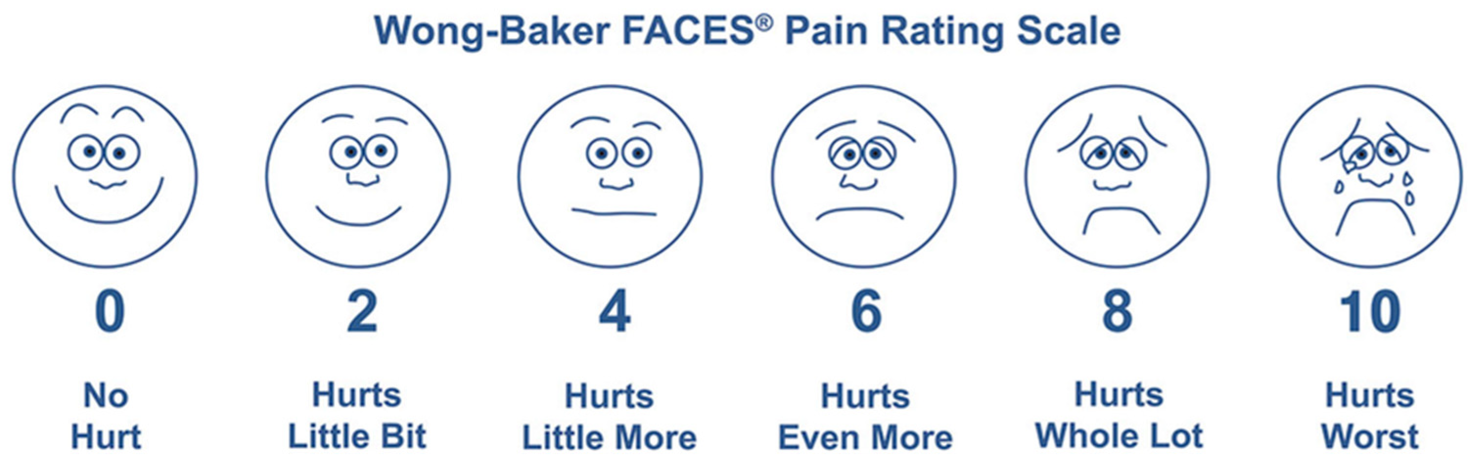 Although the questionnaire was specifically developed for the purposes of this study, pain assessment was based on the Wong–Baker FACES Pain Rating Scale, a validated and widely used tool for pain evaluation in pediatric populations, including its validated Italian version. The remaining sections of the questionnaire were designed to collect clinical and demographic information relevant to the study objectives.