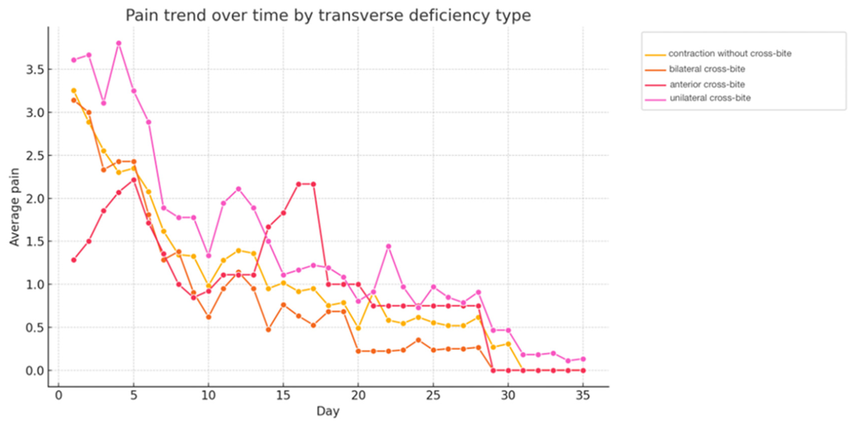 p < 0.001). In particular, patients with unilateral posterior crossbite and anterior crossbite reported the highest average pain levels. This observation suggests that the initial anatomical and occlusal configuration may influence the individual biomechanical response to maxillary expansion, as differences in sutural resistance and craniofacial constraints can affect stress distribution and displacement patterns in the maxillary complex [
