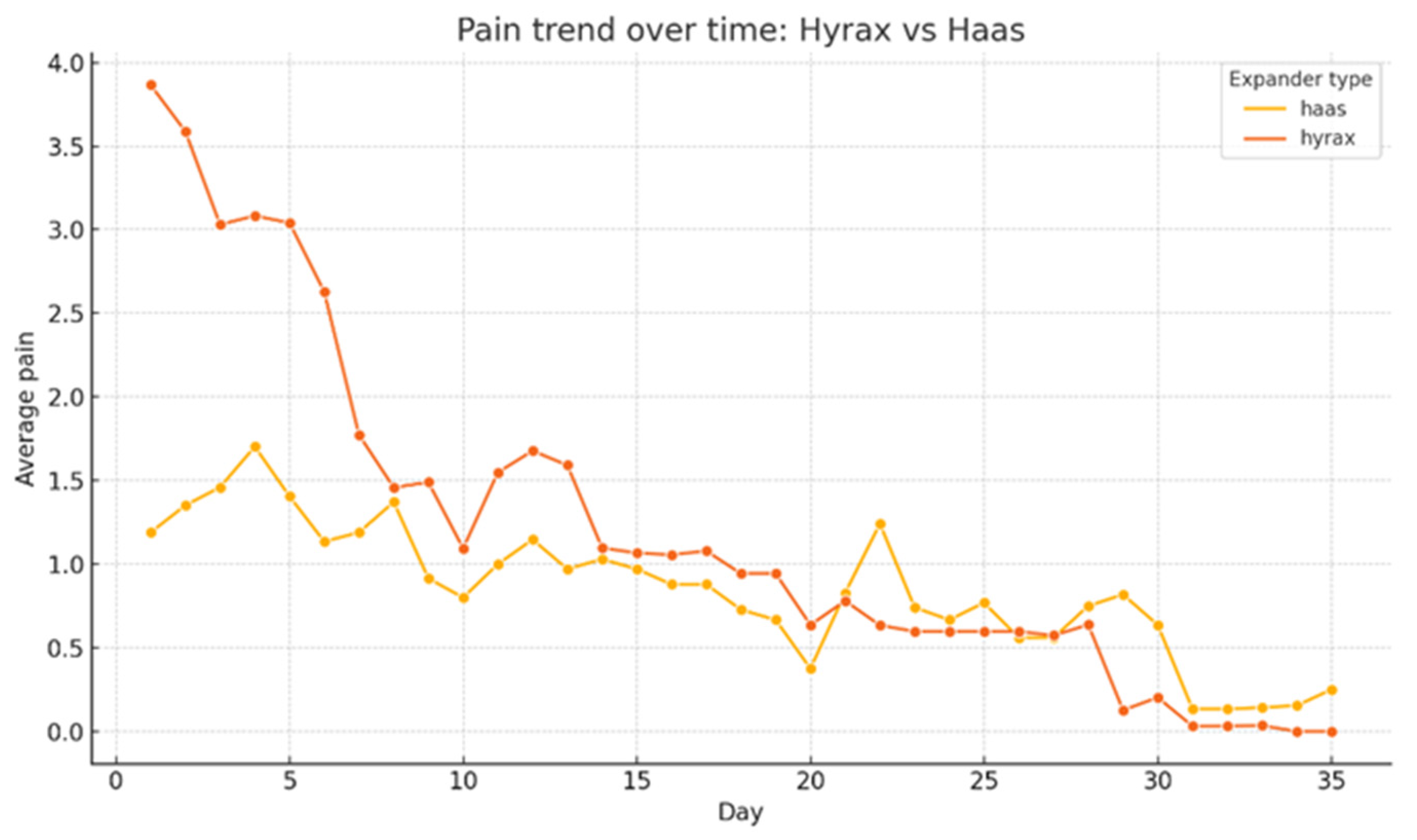 9], who found significantly greater pain on the first day of therapy in patients treated with Hyrax-type RPE if compared to those treated with Haas-type RPE, although they concluded that, except on the first day, the type of appliance did not significantly influence pain perception. The hypothesis advanced by de Araújo et al. [
