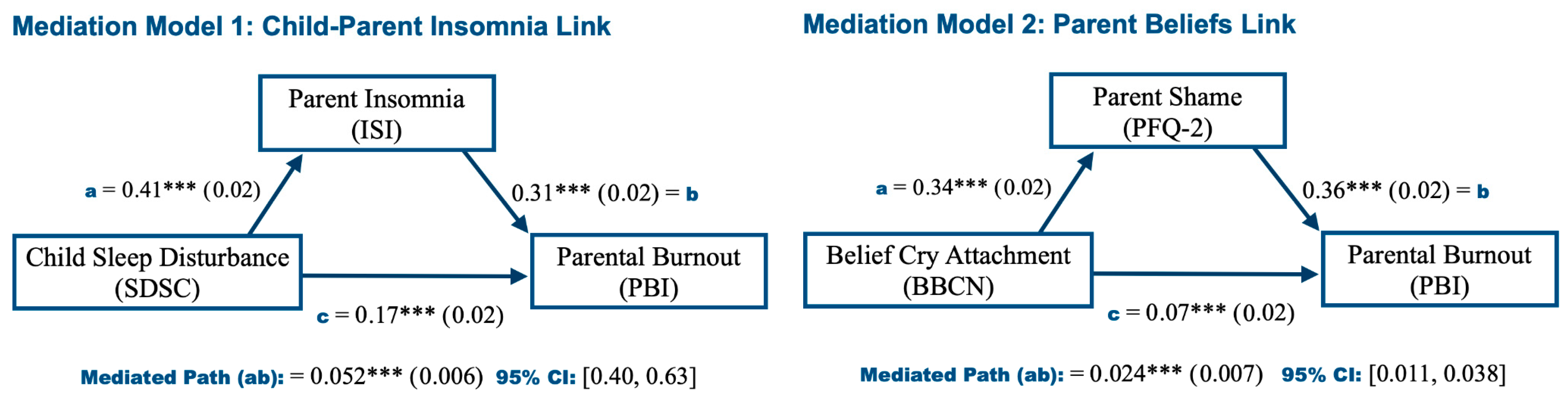 Figure 2 displays the path coefficients, their significance (by asterisks) and standard errors (in parentheses) for each of the paths modeled in the two mediation hypotheses tested. Specifically, Model 1 examines child sleep disturbances (insomnia) predicting parental insomnia, which in turn predicts higher levels of burnout, and secondly, Model 2 examines parental beliefs that nocturnal crying is linked to unmet attachment needs predicting higher levels of shame, which subsequently predicts higher levels of burnout. As shown in