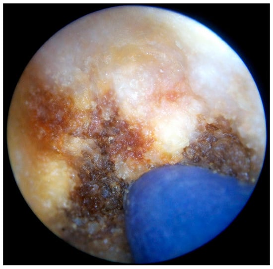 PEPSiT was performed either under regional anesthesia. The instruments used for PEPSiT include the fistuloscope (Karl Storz ® GmbH—Tuttlingen, Germany), which is 18 cm long with a diameter of 3.3 × 4.7 mm. It features an 8° scope and an irrigation/working canal that allows instruments up to 2.5 mm in diameter to be introduced (Figure 2). After ensuring adequate asepsis and proper positioning of the operating field, the procedure starts by dilating one of the fistulous tracts using a curved mosquito forceps or a 0.5 cm circular incision made with a biopsy punch. The fistuloscope is then advanced through the dilated fistula (Figure 3). A continuous jet of mannitol solution is used to maintain a clear visual field during the procedure. The instruments allow the identification of the main sinus and possible secondary tracts. Then, the hairs have been removed with an endoscopic grasper introduced through the fistuloscope working channel. Electrofulguration of the pilonidal sinus and its fistulous tracts is carried out using the endoscopic monopolar electrode (Figure 4). The brush is employed for mechanical abrasion of the fistulas and cyst walls to remove necrotic material. Any remaining hair is extracted using the fistuloscope’s forceps under endoscopic vision. Wound care involves applying a stream of iodinated povidone to the surgical wound, allowing it to penetrate the tissue (Figure 5). In the postoperative period, wound care protocols differed according to the surgical technique and were standardized within each group. After open excision surgery, patients or caregivers were instructed to keep the wound dry and to perform daily local wound care using antiseptic solution (iodinated povidone), according to institutional practice, until complete healing. After PEPSiT, patients were managed at home with twice-daily irrigation of the small external opening using 5 mL of sterile saline solution until wound closure. No additional antiseptic agents were routinely used in this group.