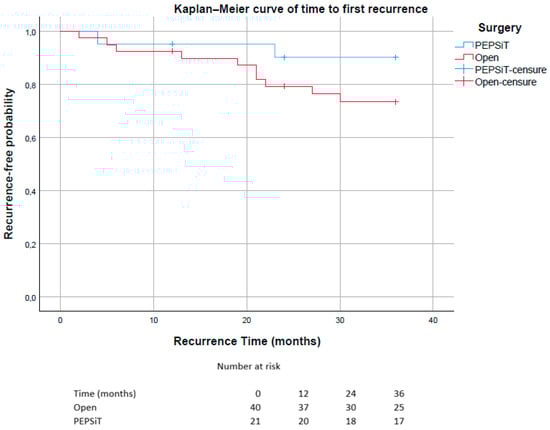 Kaplan–Meier curves showing time to first recurrence stratified by surgical technique (PEPSiT vs. Open surgery). Patients without recurrence were censored at the time of last follow-up. The number of patients at risk at selected time points (0, 12, 24 and 36 months) is reported below the graph.